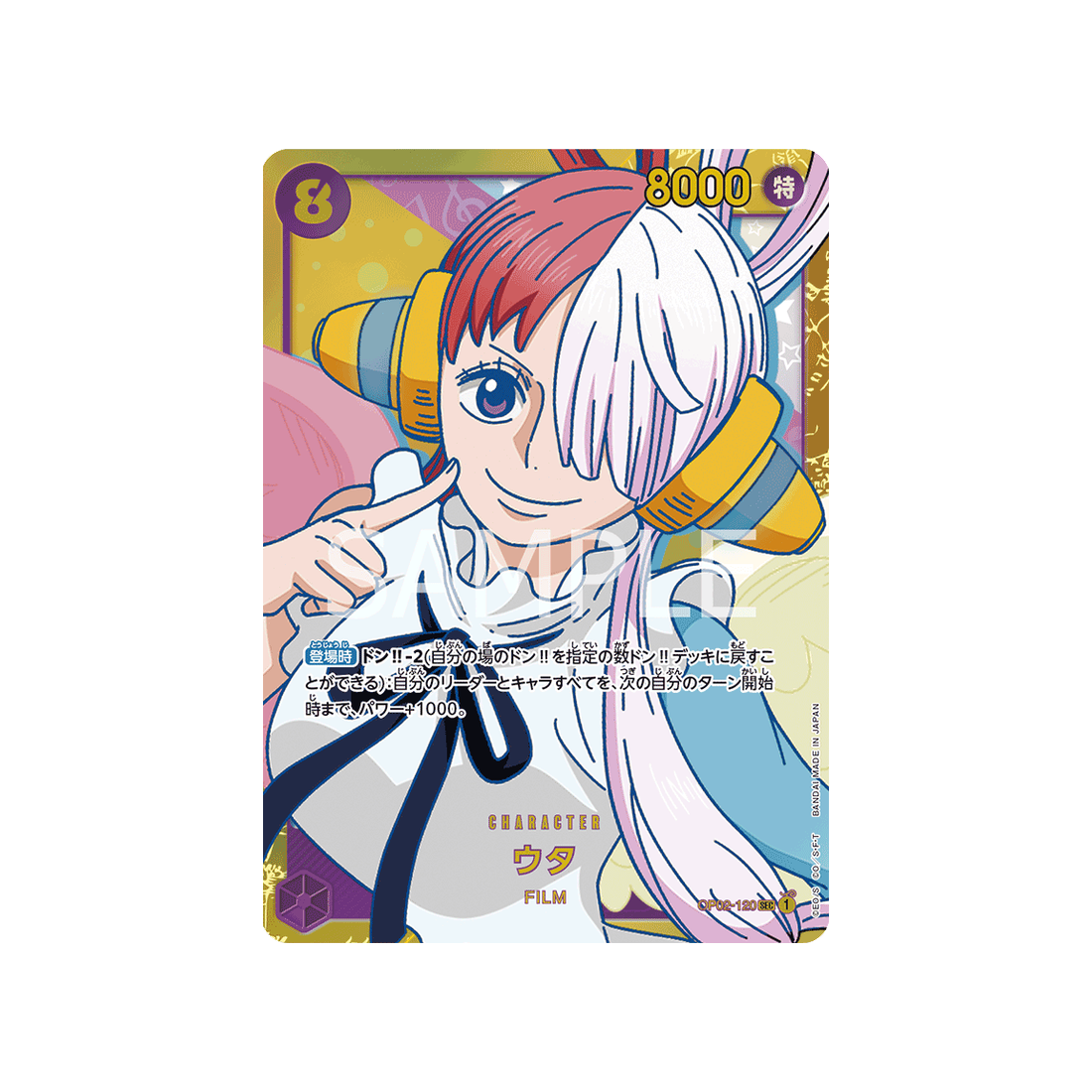 Si tu cherches une carte qui peut s'adapter à toutes les situations, ne cherchez pas plus loin que la carte OP02-120! Avec un coût de 8 'Don!', une puissance Spécial de 8000 points et de couleur Violet, la carte Character Uta est un choix fiable pour les joueurs de tous niveaux.