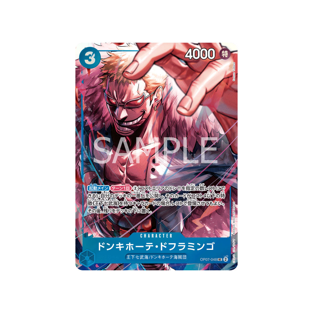 Si tu cherches une carte qui peut s'adapter à toutes les situations, ne cherches pas plus loin que la carte OPC-OP07-048-P1! Avec un coût de 3 'Don!', une puissance Spécial de 4000 points, ainsi qu'une valeur de contre de - et de couleur Bleu, la carte Character Donquixote Doflamingo est un choix fiable pour les joueurs de tous niveaux.