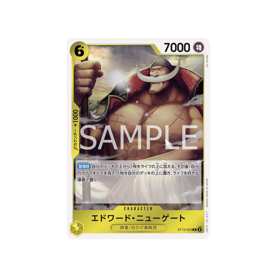 Le type Character est une carte indispensable dans tout deck qui se respecte ! Et Edward.Newgate sera ton allié le plus précieux : de couleur Jaune et avec l'attribut Spécial, il fera des ravages via un coût de 6 'Don!' et sa puissance de 7000 points, ainsi qu'une valeur de contre de 1000!