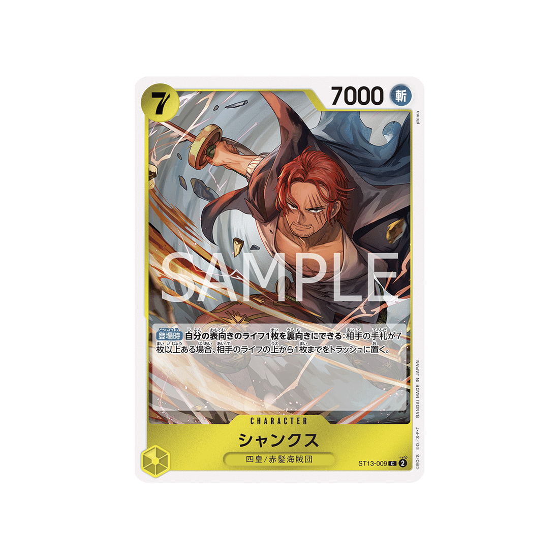 Si tu cherches une carte qui peut s'adapter à toutes les situations, ne cherchez pas plus loin que la carte ST13-009! Avec un coût de 7 'Don!', une puissance Coupe de 7000 points et de couleur Jaune, la carte Character Shanks est un choix fiable pour les joueurs de tous niveaux.