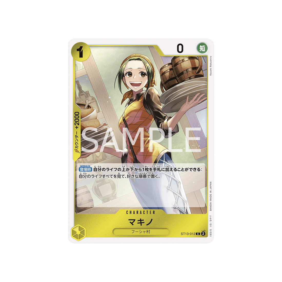 Si tu cherches une carte qui peut s'adapter à toutes les situations, ne cherchez pas plus loin que la carte ST13-012! Avec un coût de 1 'Don!', une puissance Sagesse de -0 points, ainsi qu'une valeur de contre de 2000 et de couleur Jaune, la carte Character Makino est un choix fiable pour les joueurs de tous niveaux.