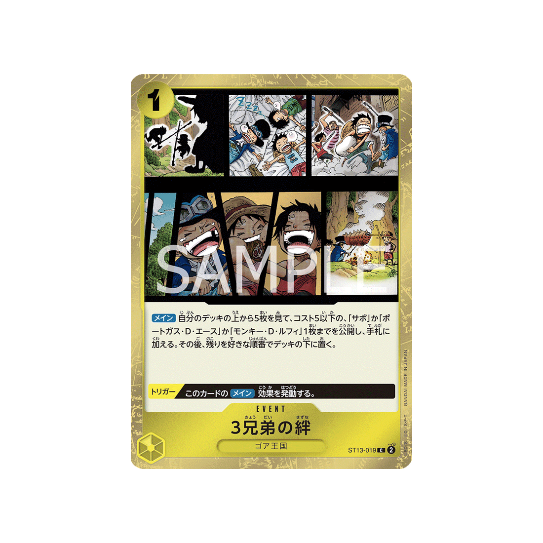 Ajoutez la carte Event The Three Brothers' Bond à votre collection One Piece dès maintenant ! Avec sa rareté C , cette carte de la série ST13 The Three Brothers' Bond est un véritable bijou pour les fans de la famille Royaume de Goa.