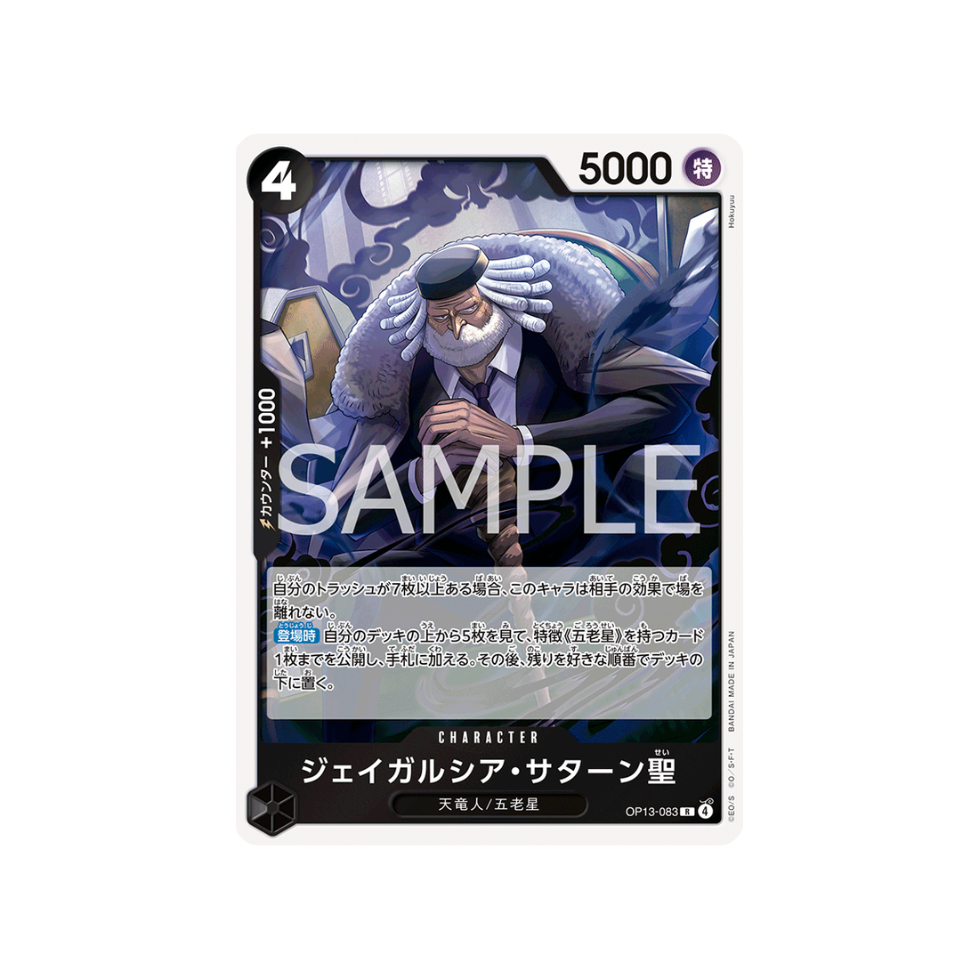 Avec un coût de 4 'Don!', une puissance de 5000 points, ainsi qu'une valeur de contre de 1000 et une attaque de type Spécial, la carte Character St. Jaygarcia Saturn est un must-have pour tout fan de One Piece qui se respecte.