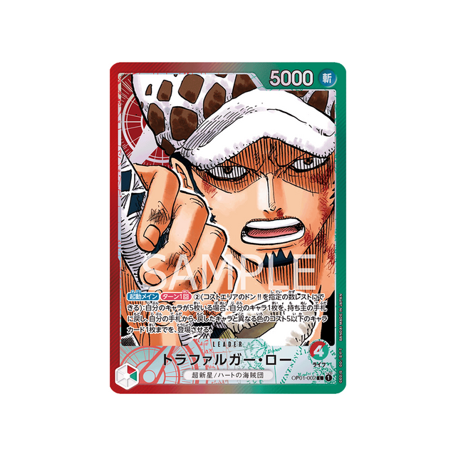 Avec ses 4 points de vie, une puissance de 5000 points et une attaque de type Coupe, la carte Leader Trafalgar Law est un must-have pour tout fan de One Piece qui se respecte.