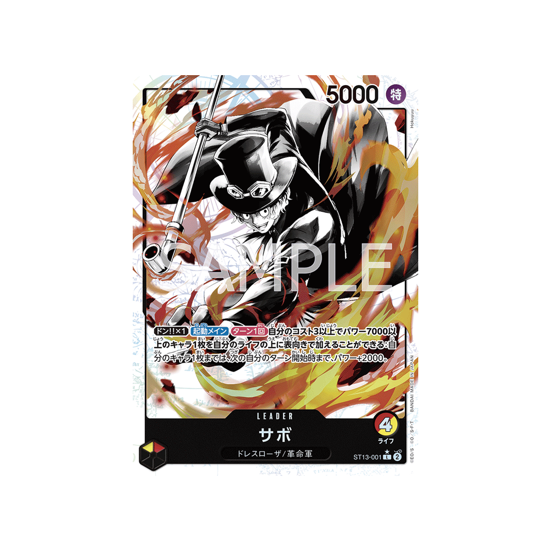 Si tu cherches une carte qui peut s'adapter à toutes les situations, ne cherchez pas plus loin que la carte ST13-001! Avec ses 4 points de vie, une puissance Spécial de 5000 points et de couleur Rouge/Jaune, la carte Leader Sabo est un choix fiable pour les joueurs de tous niveaux.