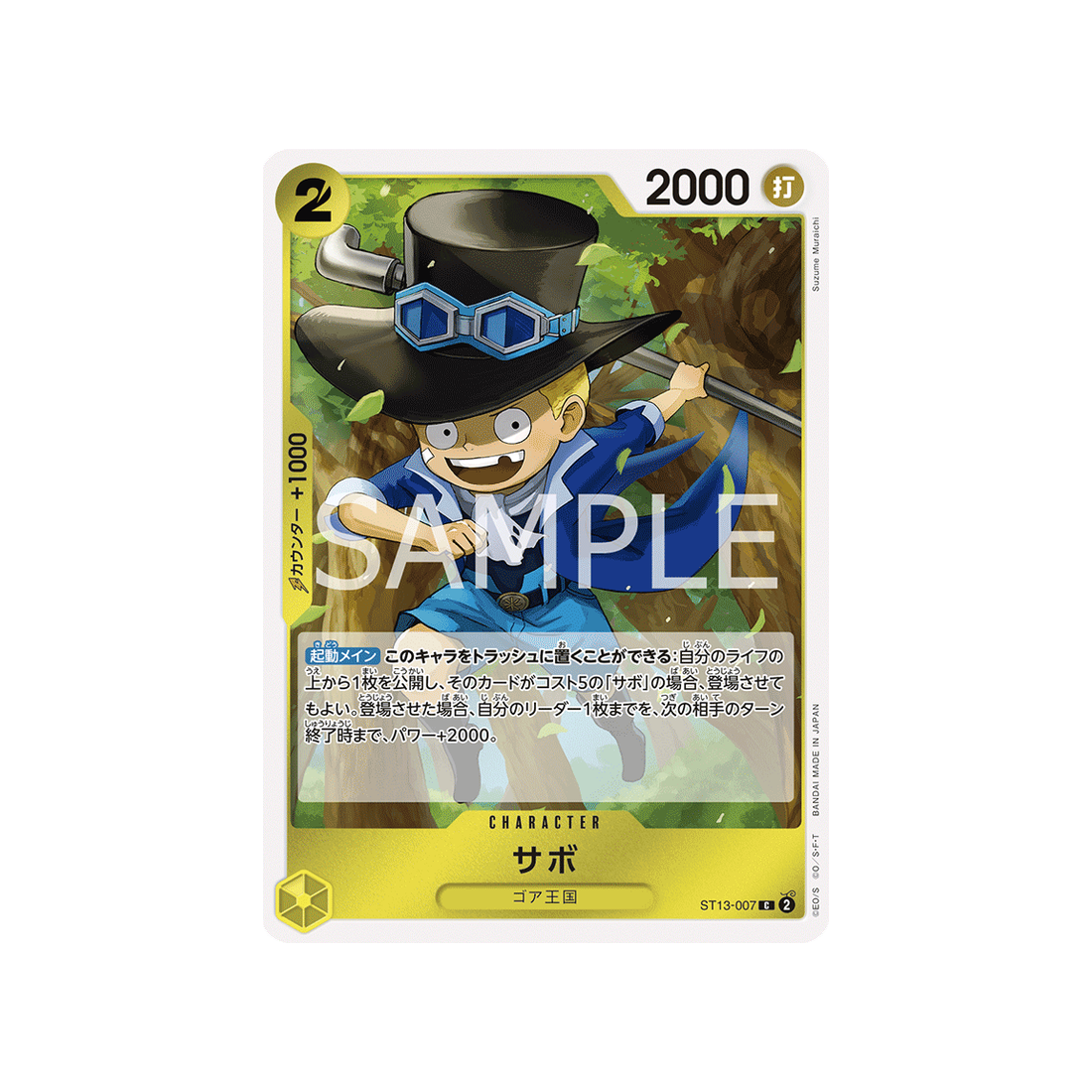 Si tu cherches une carte qui peut s'adapter à toutes les situations, ne cherchez pas plus loin que la carte ST13-007! Avec un coût de 2 'Don!', une puissance Frappe de 2000 points, ainsi qu'une valeur de contre de 1000 et de couleur Jaune, la carte Character Sabo est un choix fiable pour les joueurs de tous niveaux.