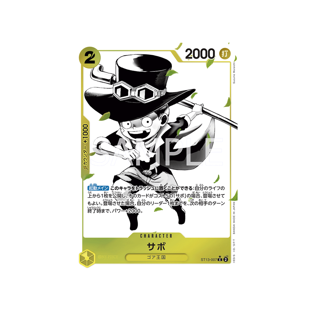 【Activation: Principal】 Vous pouvez éliminer ce Personnage: révélez 1 carte du dessus de vos cartes Vie. Si cette carte est un 【Sabo】 avec un coût de 5, vous pouvez jouer cette carte. Si vous le faites, jusqu'à 1 de vos Leaders gagne +2000 de puissance jusqu'à la fin du prochain tour de votre adversaire.