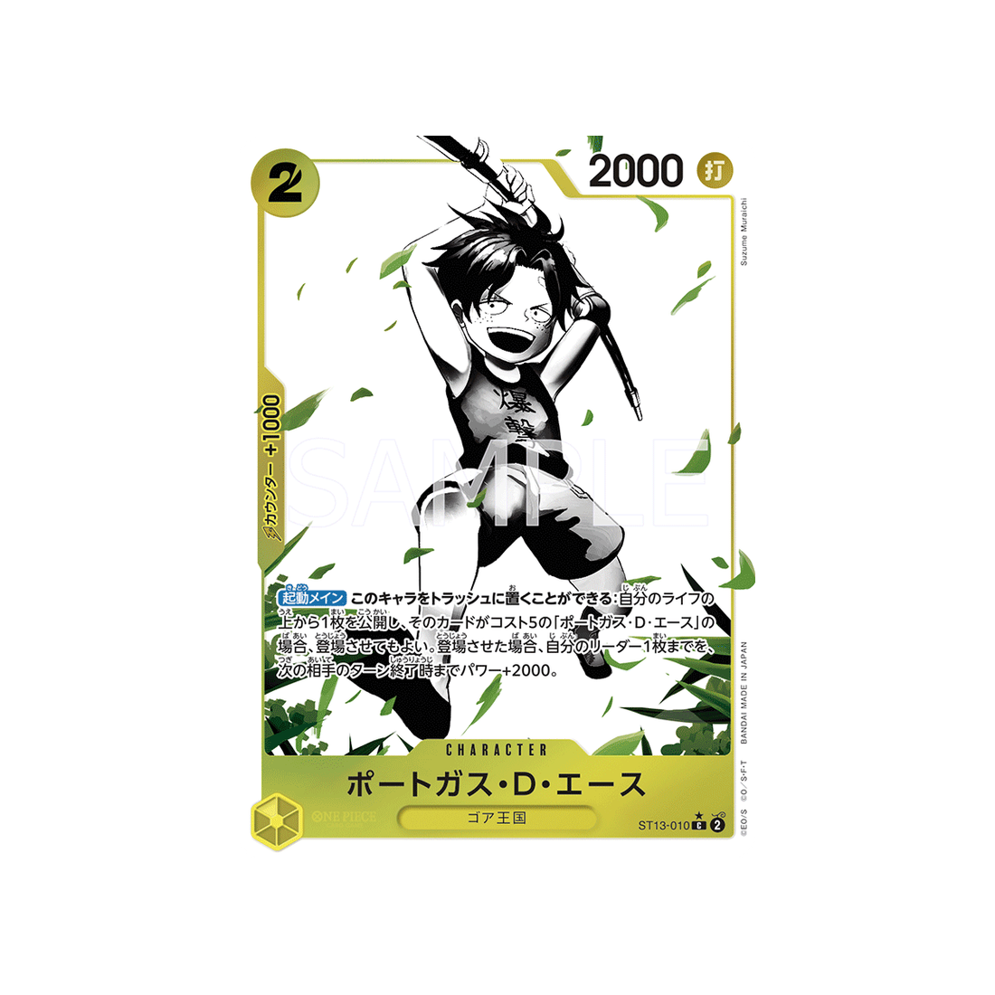 Le type Character est une carte indispensable dans tout deck qui se respecte ! Et Portgas.D.Ace sera ton allié le plus précieux : de couleur Jaune et avec l'attribut Frappe, il fera des ravages via un coût de 2 'Don!' et sa puissance de 2000 points, ainsi qu'une valeur de contre de 1000!