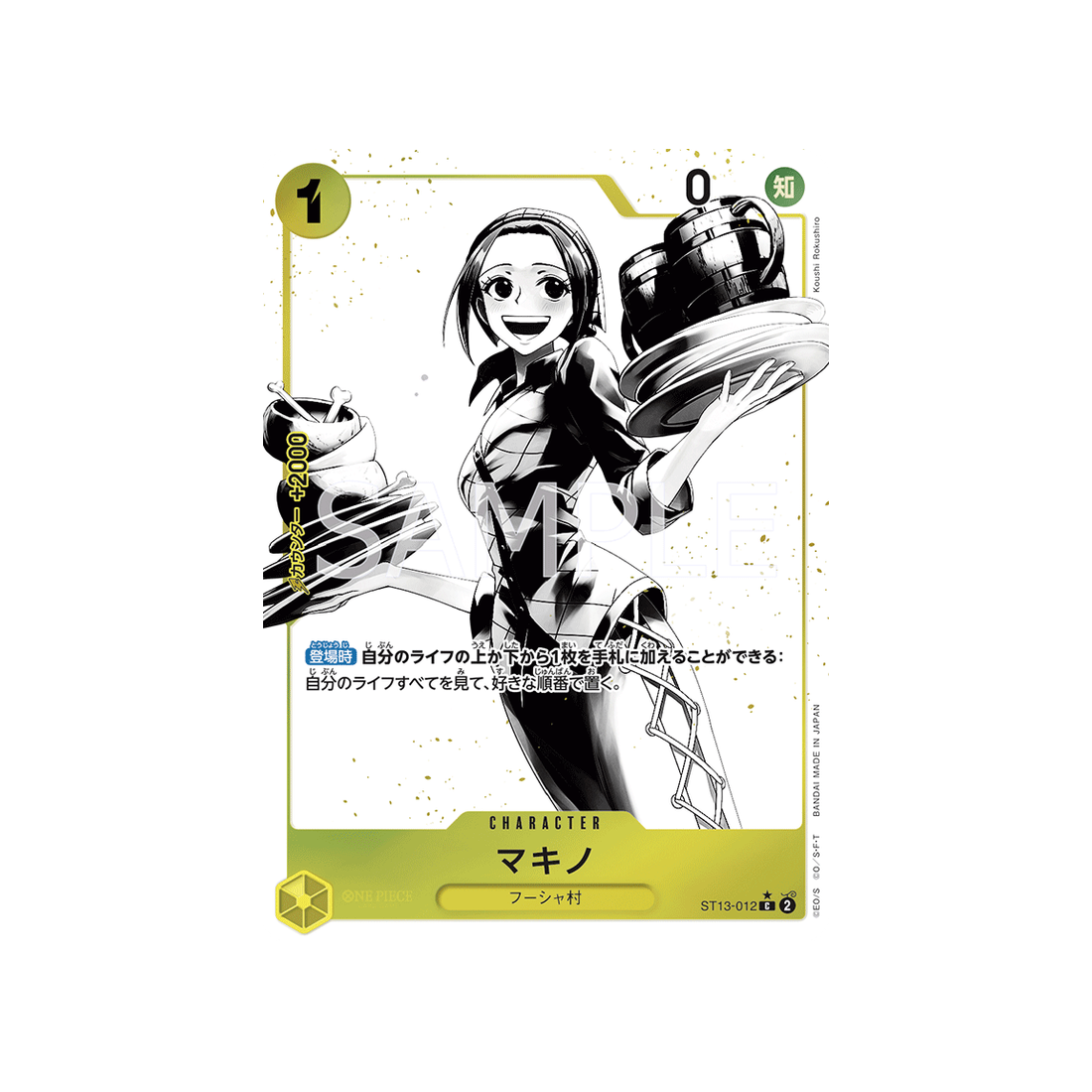 Si tu cherches une carte qui peut s'adapter à toutes les situations, ne cherchez pas plus loin que la carte ST13-012! Avec un coût de 1 'Don!', une puissance Sagesse de -0 points, ainsi qu'une valeur de contre de 2000 et de couleur Jaune, la carte Character Makino est un choix fiable pour les joueurs de tous niveaux.