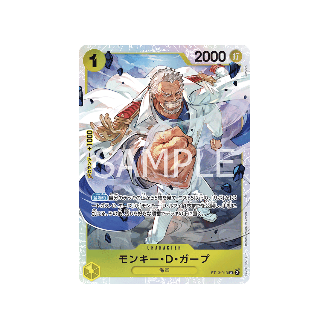 Si tu cherches une carte qui peut s'adapter à toutes les situations, ne cherchez pas plus loin que la carte ST13-013! Avec un coût de 1 'Don!', une puissance Frappe de 2000 points, ainsi qu'une valeur de contre de 1000 et de couleur Jaune, la carte Character Monkey.D.Garp est un choix fiable pour les joueurs de tous niveaux.