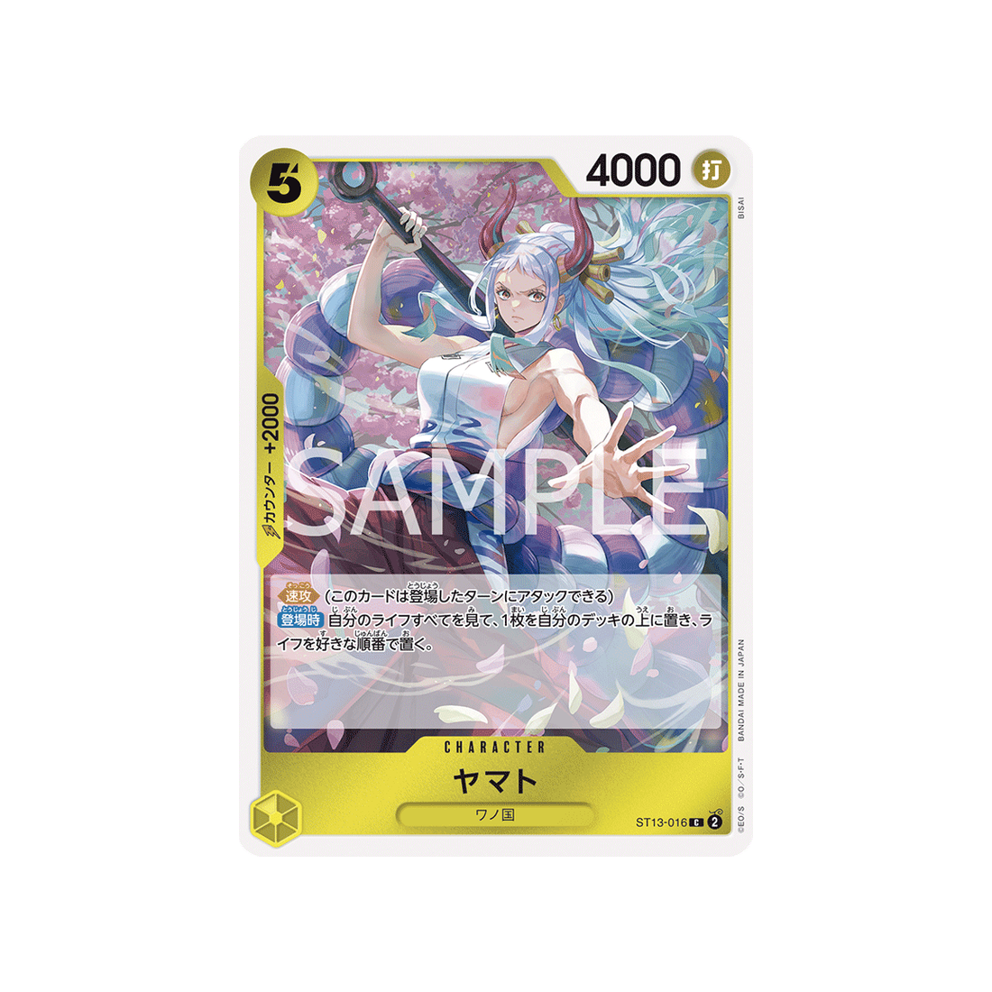Avec un coût de 5 'Don!', une puissance de 4000 points, ainsi qu'une valeur de contre de 2000 et une attaque de type Frappe, la carte Character Yamato est un must-have pour tout fan de One Piece qui se respecte.