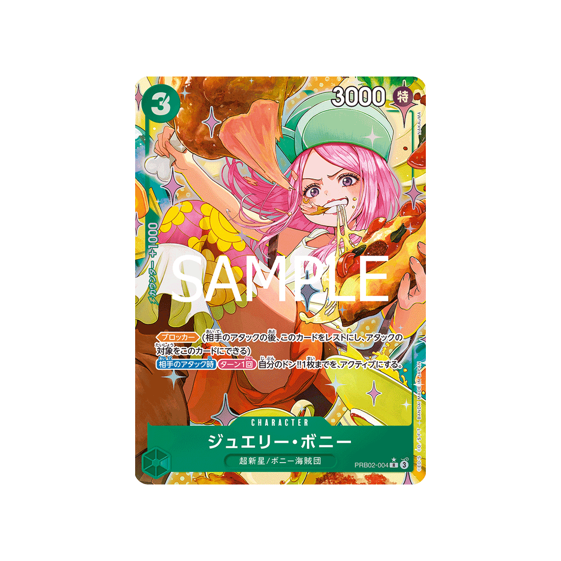 Si tu cherches une carte qui peut s'adapter à toutes les situations, ne cherches pas plus loin que la carte OPC-PRB02-004-P1! Avec un coût de 3 'Don!', une puissance Spécial de 3000 points, ainsi qu'une valeur de contre de 1000 et de couleur Vert, la carte Character Jewelry Bonney est un choix fiable pour les joueurs de tous niveaux.