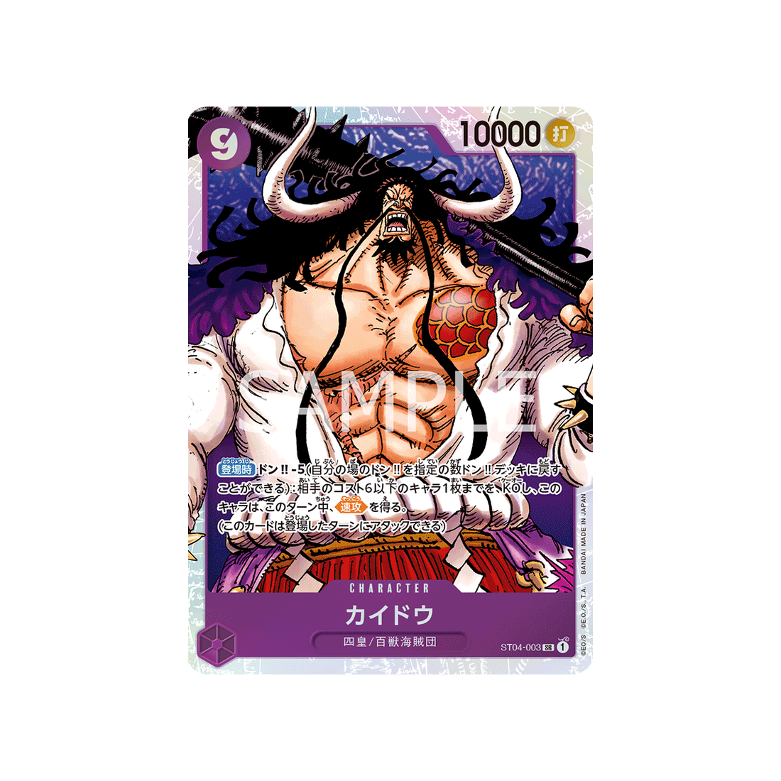 Avec un coût de 9 'Don!', une puissance de 10000 points et une attaque de type Frappe, la carte Character Kaido est un must-have pour tout fan de One Piece qui se respecte.