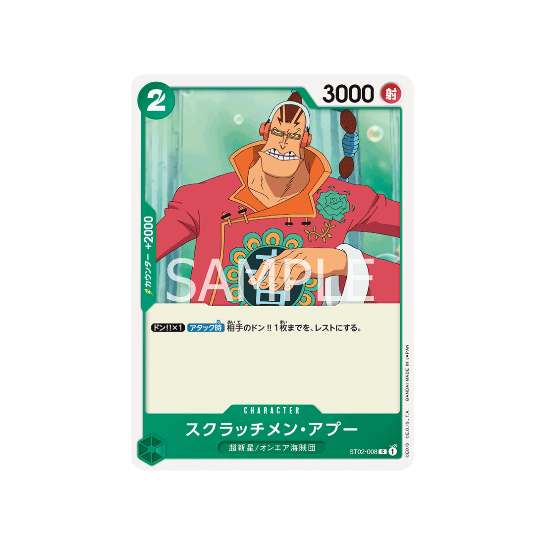 Si tu cherches une carte qui peut s'adapter à toutes les situations, ne cherchez pas plus loin que la carte ST02-008! Avec un coût de 2 'Don!', une puissance Distance de 3000 points, ainsi qu'une valeur de contre de 2000 et de couleur Vert, la carte Character Scratchmen Apoo est un choix fiable pour les joueurs de tous niveaux.
