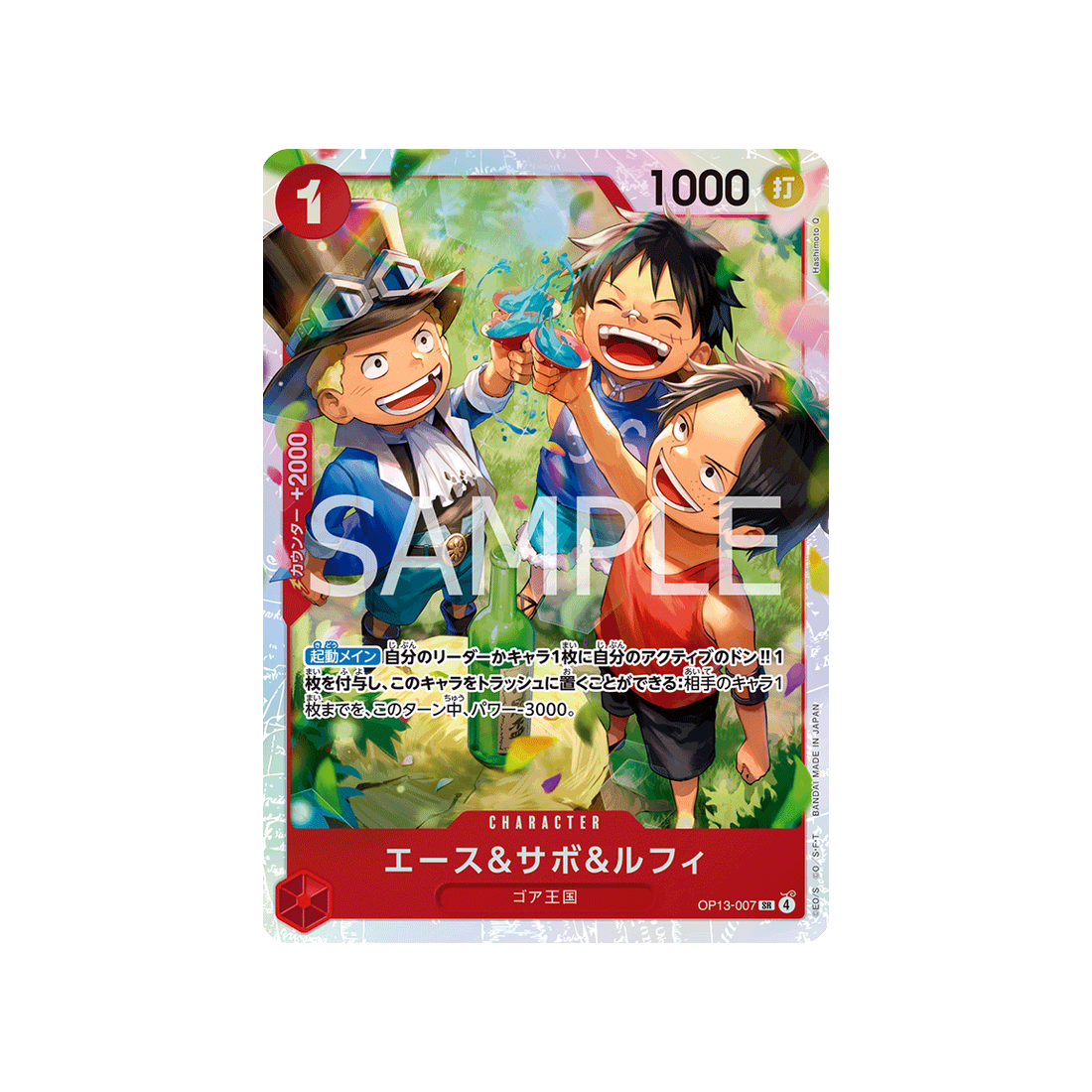 Deviens le maître des mers avec la carte Super Rare numéro OP13-007 : Ace & Sabo & Luffy, une carte de collection indispensable pour tout fan de One Piece.