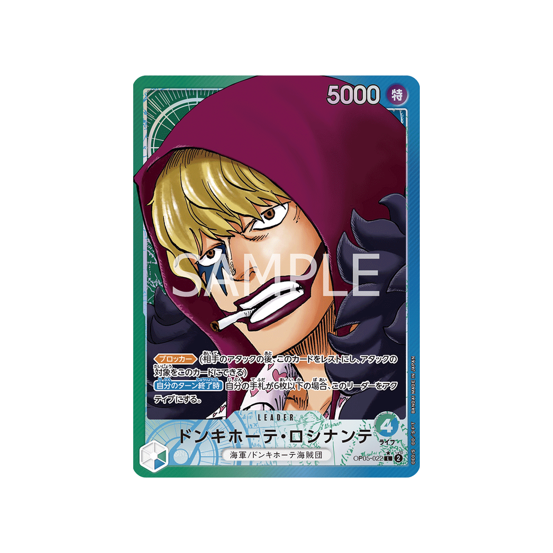 Le type Leader est une carte indispensable dans tout deck qui se respecte ! Et Donquixote Rosinante sera ton allié le plus précieux : de couleur Vert/Bleu et avec l'attribut Spécial, il fera des ravages via ses 4 points de vie et sa puissance de 5000 points!