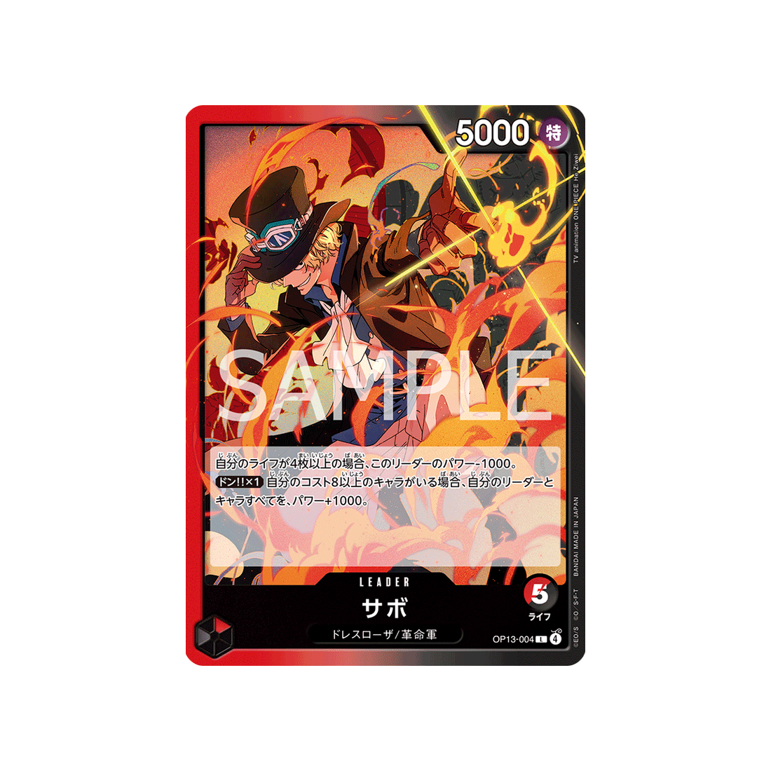 Les cartes de la famille Dressrosa/Armée Révolutionnaire sont toujours très prisées par les collectionneurs, et la carte Leader Sabo Numéro OP13-004 de la série Carrying on His Will ne fait pas exception.