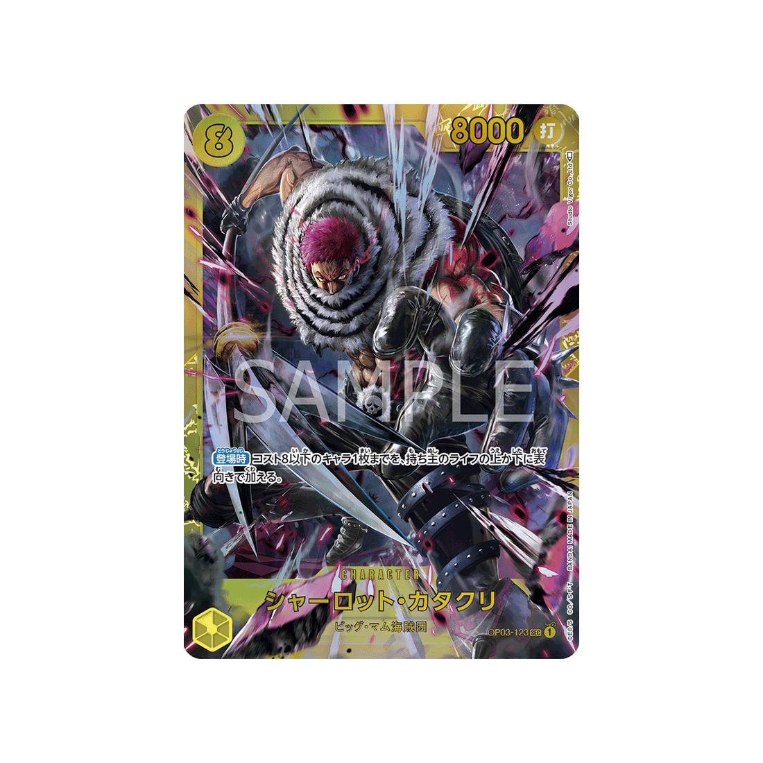 Ajoutez la carte Character Charlotte Katakuri à votre collection One Piece dès maintenant ! Avec sa rareté SEC , cette carte de la série OP03 Mighty Enemies est un véritable bijou pour les fans de la famille Equipage de Big Mom.