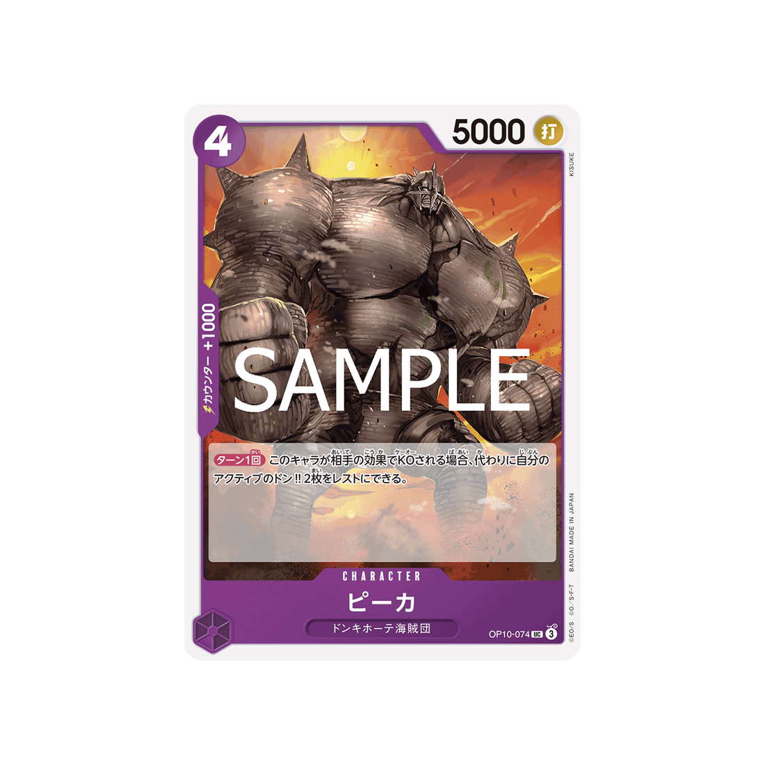 Si tu cherches une carte qui peut s'adapter à toutes les situations, ne cherches pas plus loin que la carte OP10-074! Avec un coût de 4 'Don!', une puissance Frappe de 5000 points, ainsi qu'une valeur de contre de 1000 et de couleur Violet, la carte Character Pica est un choix fiable pour les joueurs de tous niveaux.