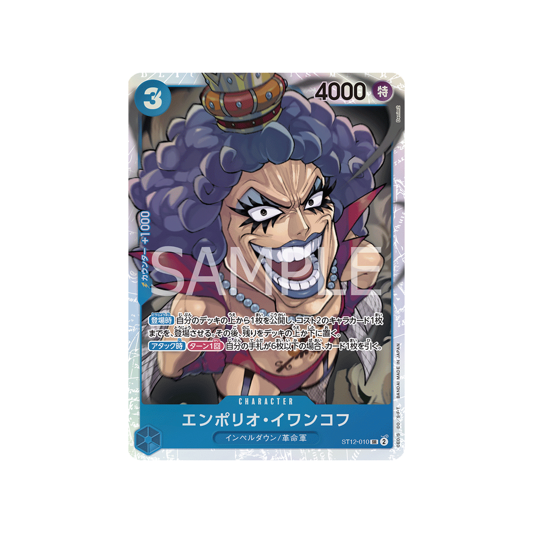 Si tu cherches une carte qui peut s'adapter à toutes les situations, ne cherchez pas plus loin que la carte ST12-010! Avec un coût de 3 'Don!', une puissance Spécial de 4000 points, ainsi qu'une valeur de contre de 1000 et de couleur Bleu, la carte Character Emporio.Ivankov est un choix fiable pour les joueurs de tous niveaux.