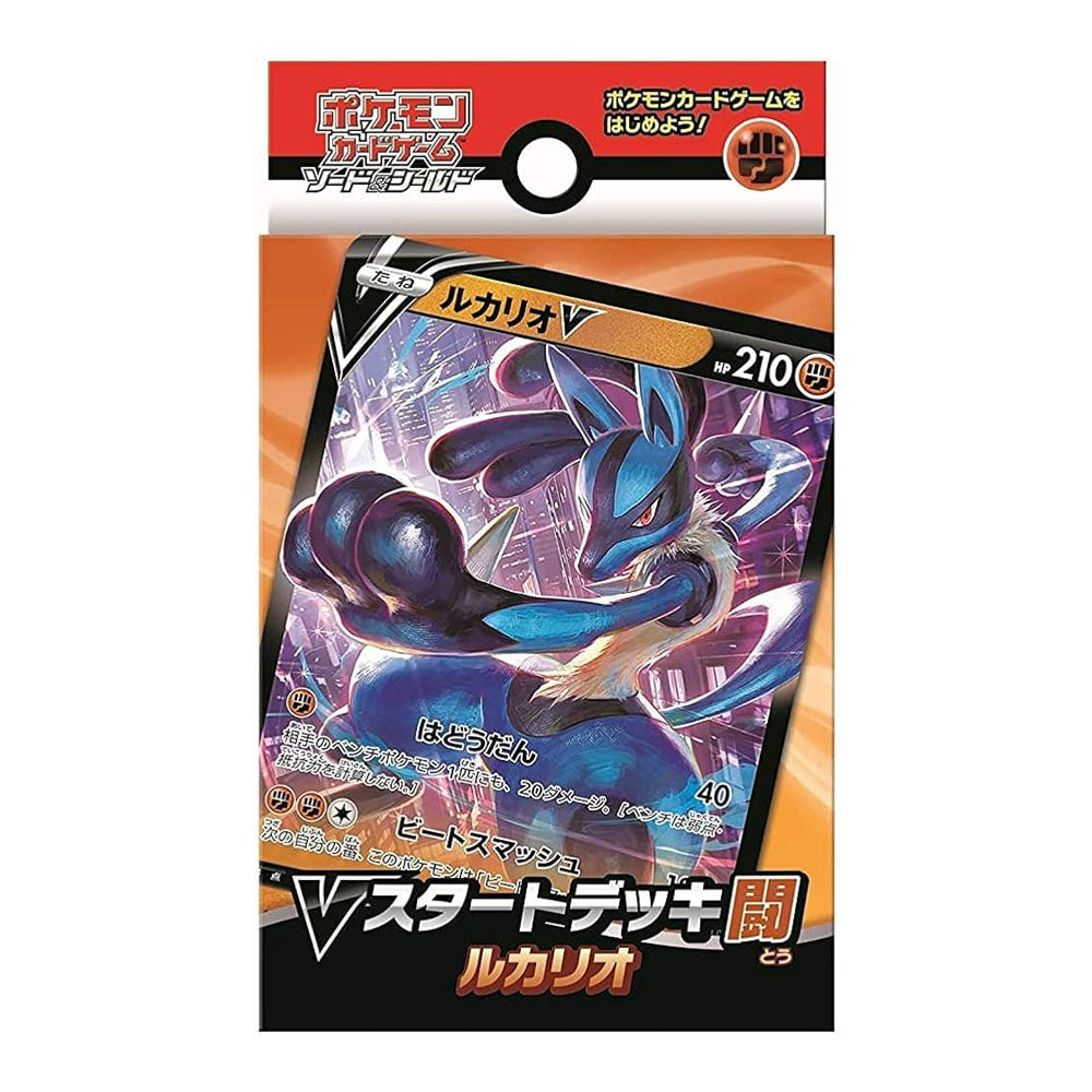 En plus de Lucario V, ce starter deck de 60 cartes japonaise, contient des cartes Tygnon, Groudon, Pandespiègle, Pandarbare, Rocabot, Lougaroc, Dunaja et Dunaconda.