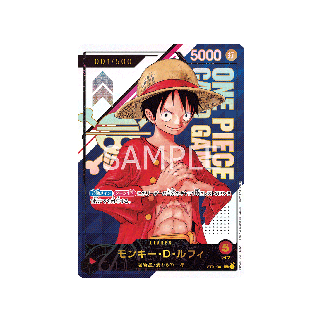 Que tu sois novice ou joueur expérimenté, la carte ST01-001 est un choix fiable. Avec un coût de 5, ainsi qu'une valeur de contre de - et une attaque de type Frappe d'une puissance de 5000 points, elle peut s'adapter à toutes les situations. Un incontournable pour tout duelliste One Piece TCG !