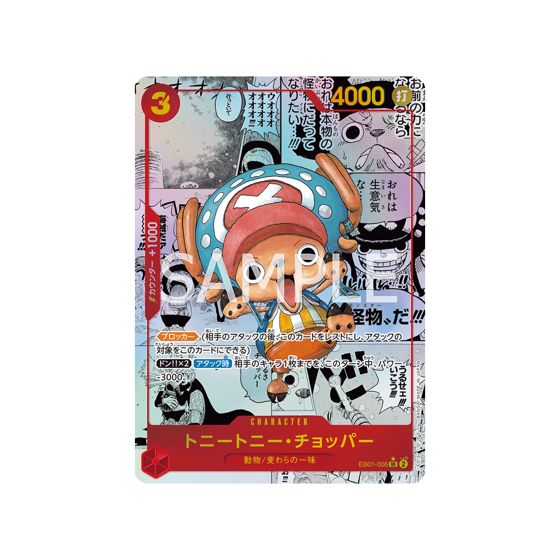 Avec un coût de 3 'Don!', une puissance de 4000 points, ainsi qu'une valeur de contre de 1000 et une attaque de type Frappe, la carte Character Tony Tony.Chopper est un must-have pour tout fan de One Piece qui se respecte.