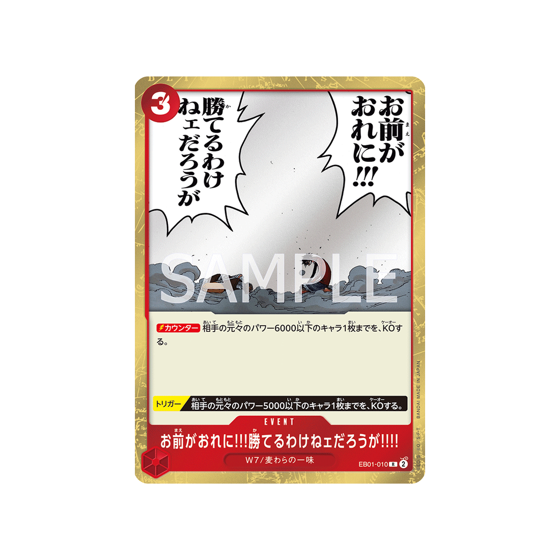 Ajoutez la carte Event There's No Way You Could Defeat Me!! à votre collection One Piece dès maintenant ! Avec sa rareté R , cette carte de la série EB01 Memorial Collection est un véritable bijou pour les fans de la famille Water Seven/Equipage du Chapeau de Paille.