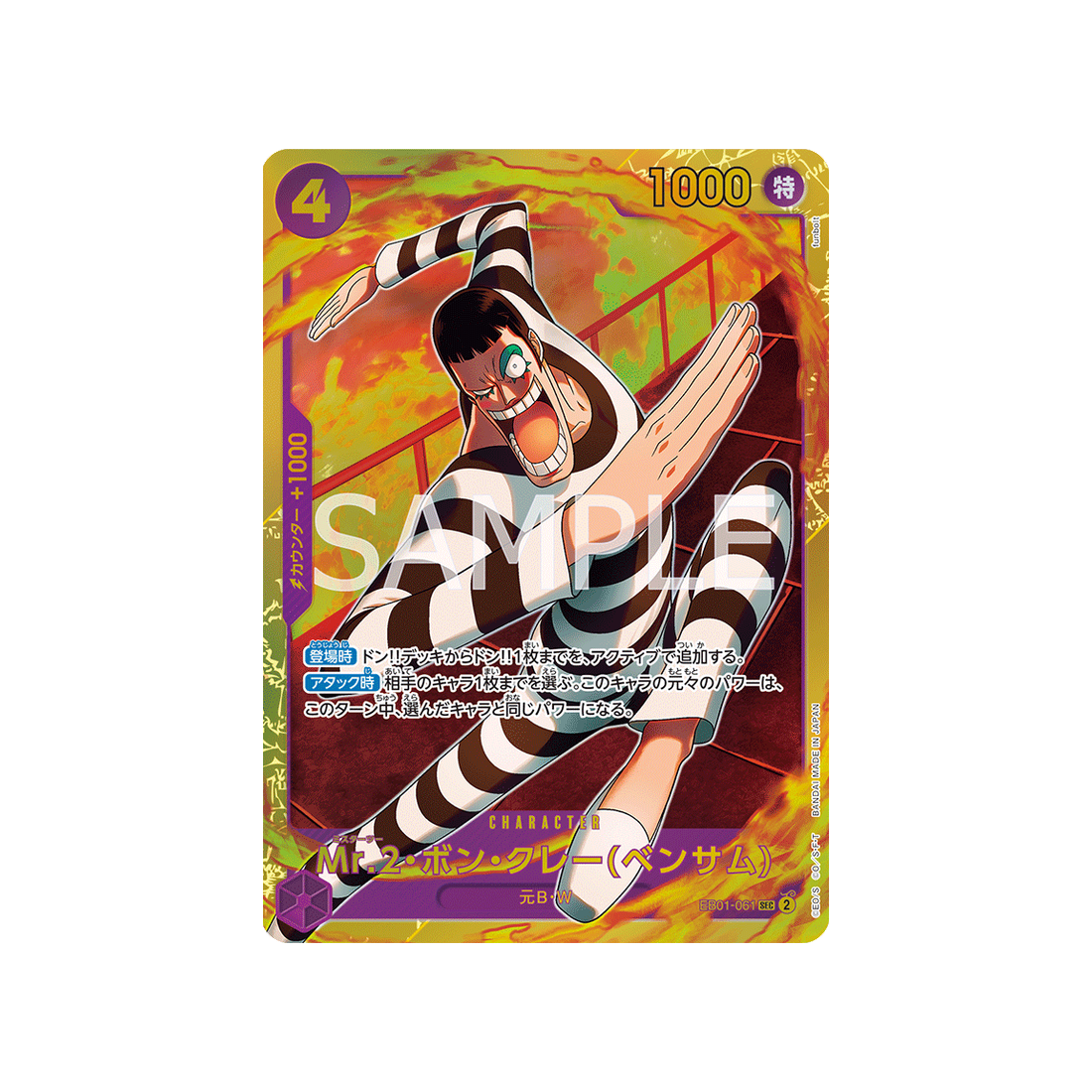 Le type Character est une carte indispensable dans tout deck qui se respecte ! Et Mr.2.Bon.Kurei(Bentham) sera ton allié le plus précieux : de couleur Violet et avec l'attribut Spécial, il fera des ravages via un coût de 4 'Don!' et sa puissance de 1000 points, ainsi qu'une valeur de contre de 1000!