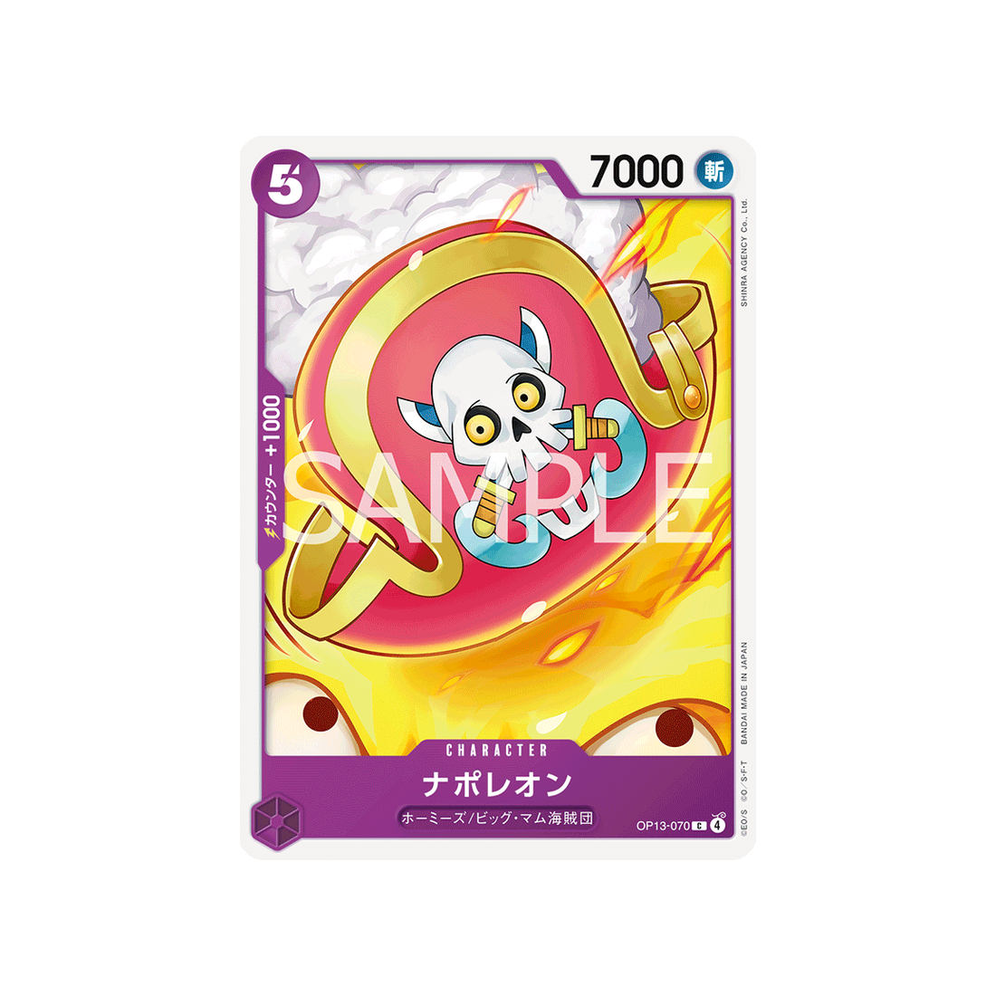 Ne cherches plus ! Voici la carte Character ultime pour tous les fans de One Piece : la carte Napoléon numéro OP13-070 de la série Carrying on His Will ! De rareté Commune, cette carte est un véritable joyau à ajouter à ta collection.