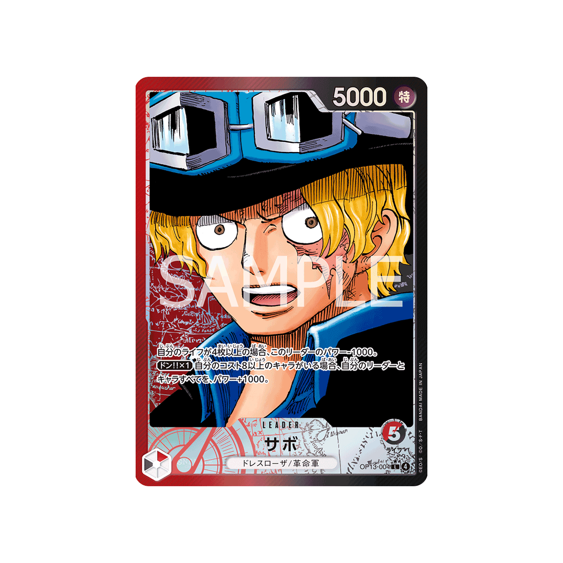Le type Leader est une carte indispensable dans tout deck qui se respecte ! Et Sabo sera ton allié le plus précieux : de couleur Rouge/Noir et avec l'attribut Spécial, il fera des ravages via ses 5 points de vie et sa puissance de 5000 points, ainsi qu'une valeur de contre de -!