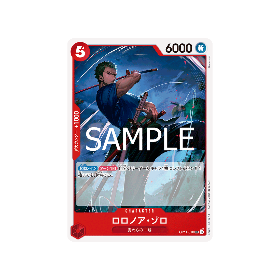 Avec un coût de 5 'Don!', une puissance de 6000 points, ainsi qu'une valeur de contre de 1000 et une attaque de type Coupe, la carte Character Roronoa Zoro est un must-have pour tout fan de One Piece qui se respecte.