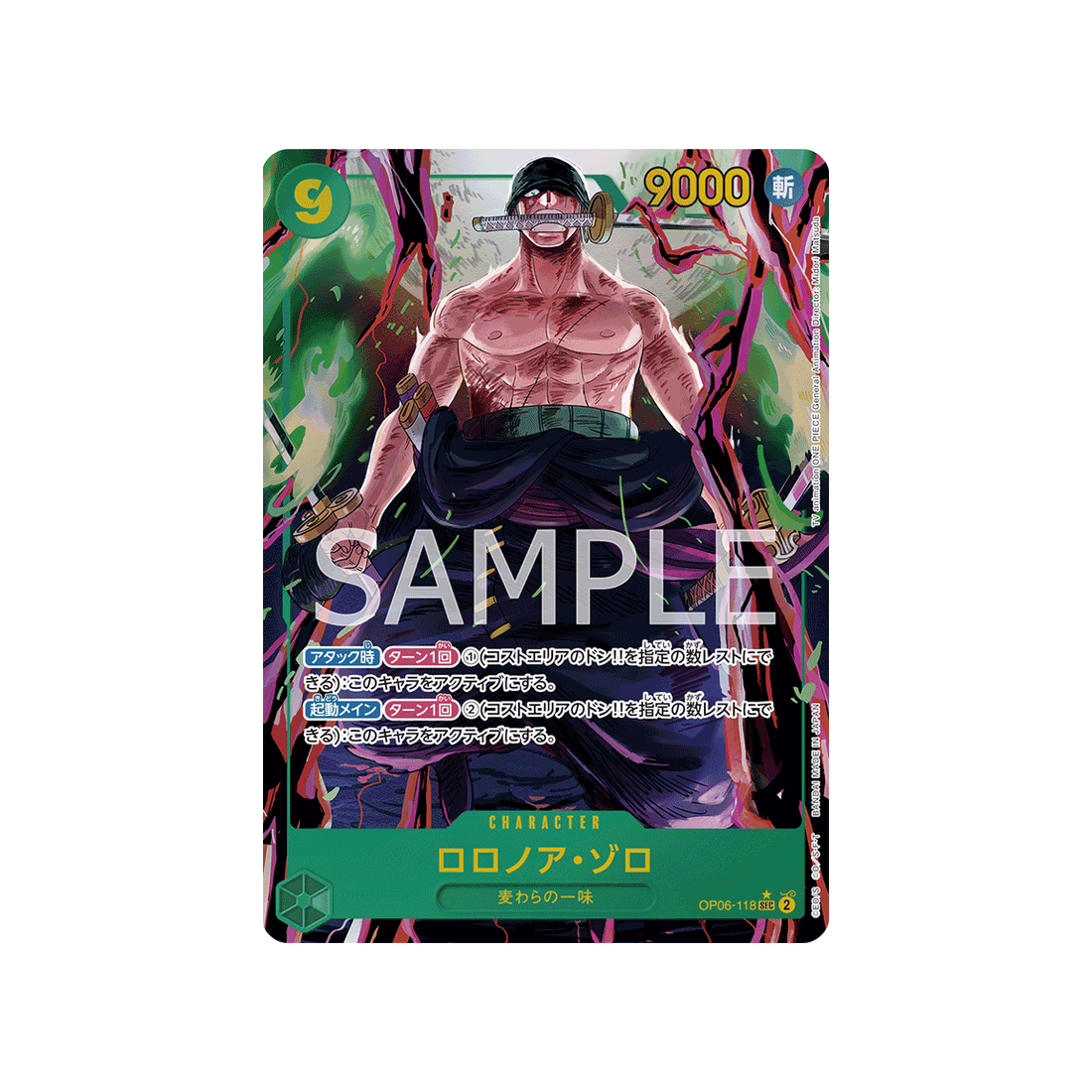 Si tu cherches une carte qui peut s'adapter à toutes les situations, ne cherchez pas plus loin que la carte OP06-118! Avec un coût de 9 'Don!', une puissance Coupe de 9000 points et de couleur Vert, la carte Character Roronoa Zoro est un choix fiable pour les joueurs de tous niveaux.