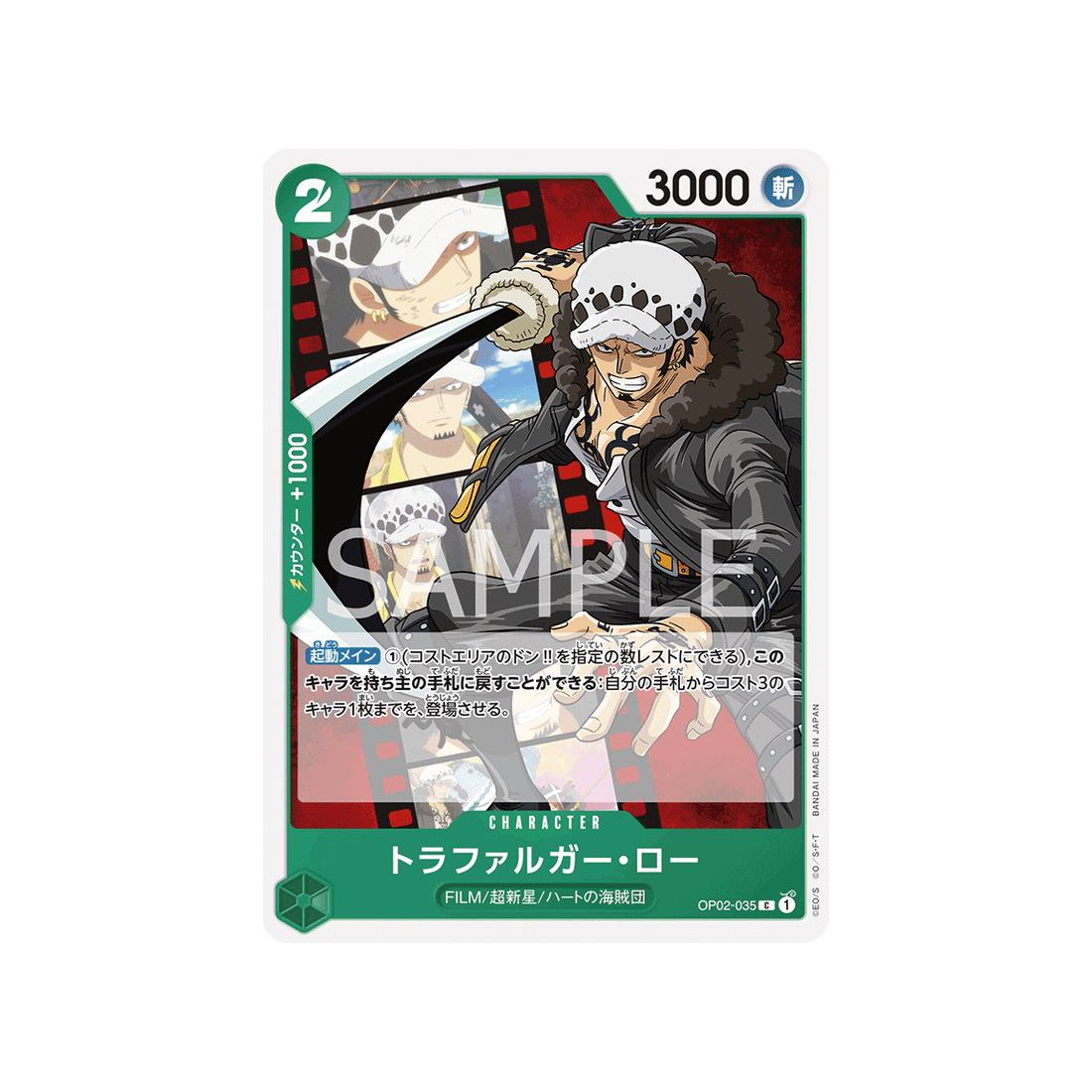 Si tu cherches une carte qui peut s'adapter à toutes les situations, ne cherchez pas plus loin que la carte OP02-035! Avec un coût de 2 'Don!', une puissance Coupe de 3000 points, ainsi qu'une valeur de contre de 1000 et de couleur Vert, la carte Character Trafalgar Law est un choix fiable pour les joueurs de tous niveaux.