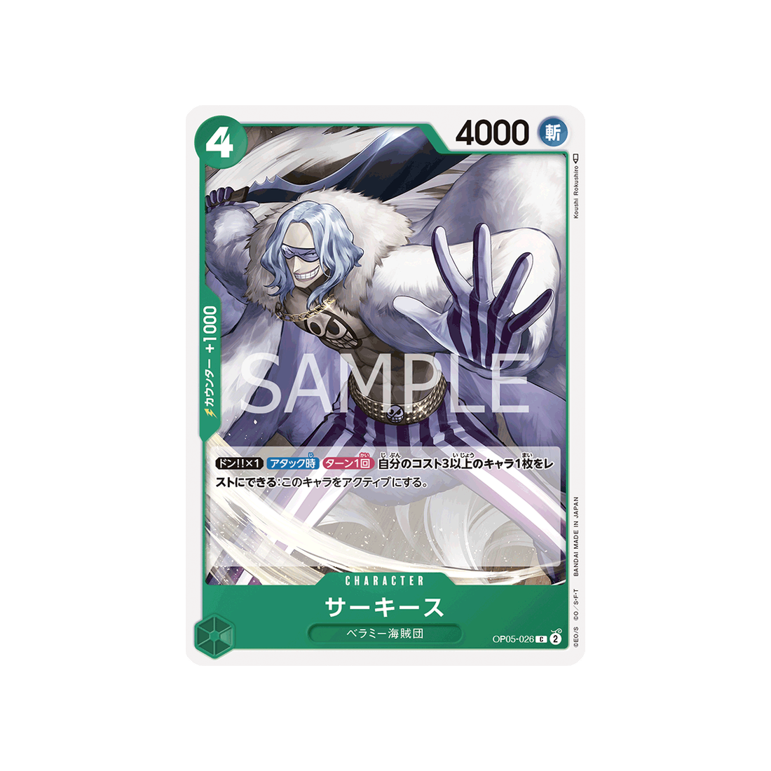 Si tu cherches une carte qui peut s'adapter à toutes les situations, ne cherchez pas plus loin que la carte OP05-026! Avec un coût de 4 'Don!', une puissance Coupe de 4000 points, ainsi qu'une valeur de contre de 1000 et de couleur Vert, la carte Character Sarquiss est un choix fiable pour les joueurs de tous niveaux.