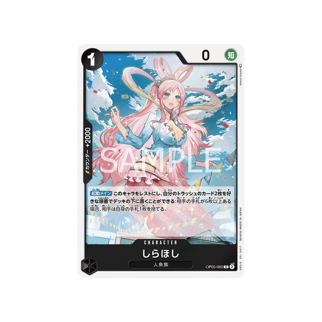 Si tu cherches une carte qui peut s'adapter à toutes les situations, ne cherchez pas plus loin que la carte OP05-082! Avec un coût de 1 'Don!', une puissance Sagesse de - points, ainsi qu'une valeur de contre de 2000 et de couleur Noir, la carte Character Shirahoshi est un choix fiable pour les joueurs de tous niveaux.