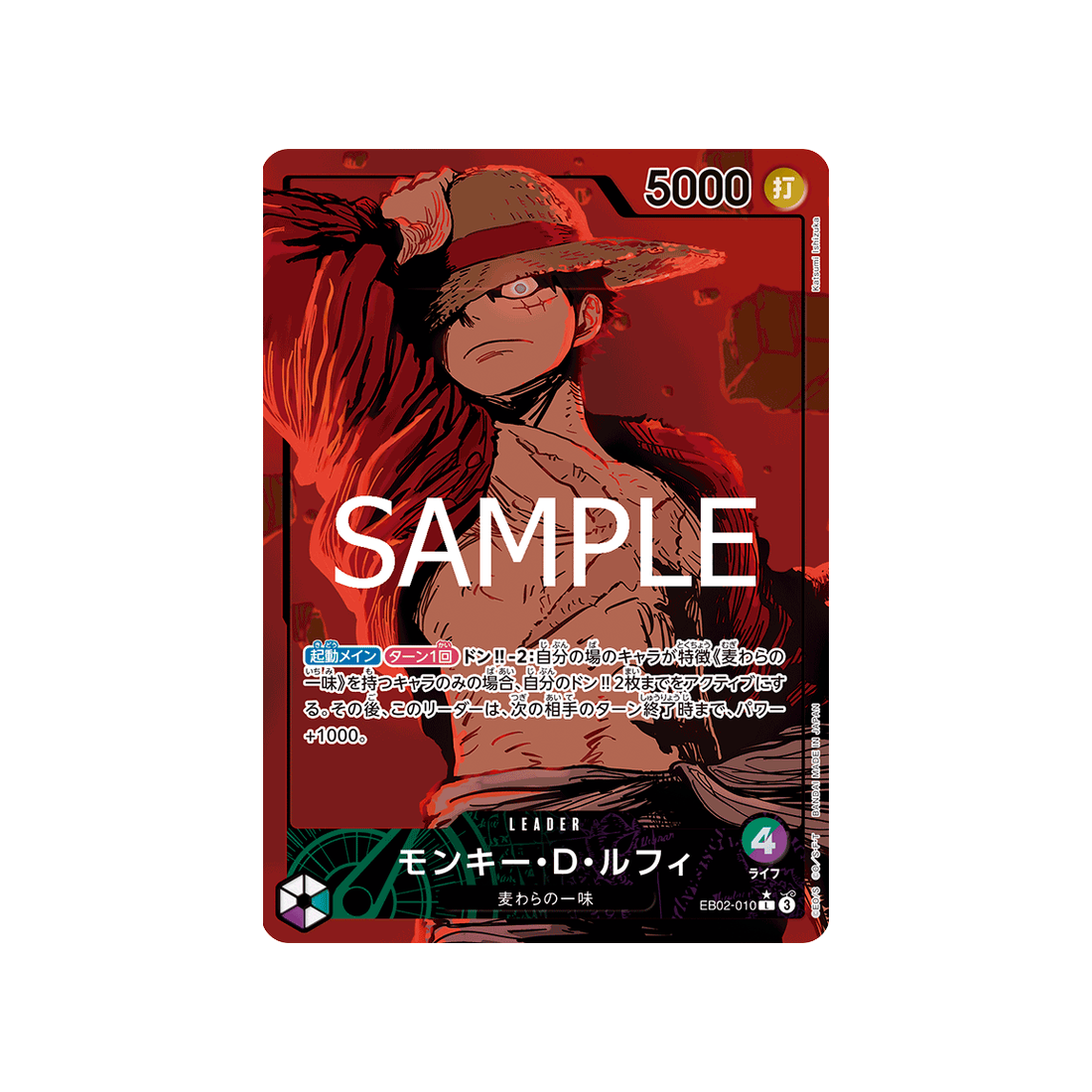 Prépare-toi à affronter tous les défis avec la magnifique carte Leader Monkey.D.Luffy dans sa version Parallèle 1numéro EB02-010 de la série Anime 25th collection, une carte Leader et puissante qui fera la fierté de ta collection.