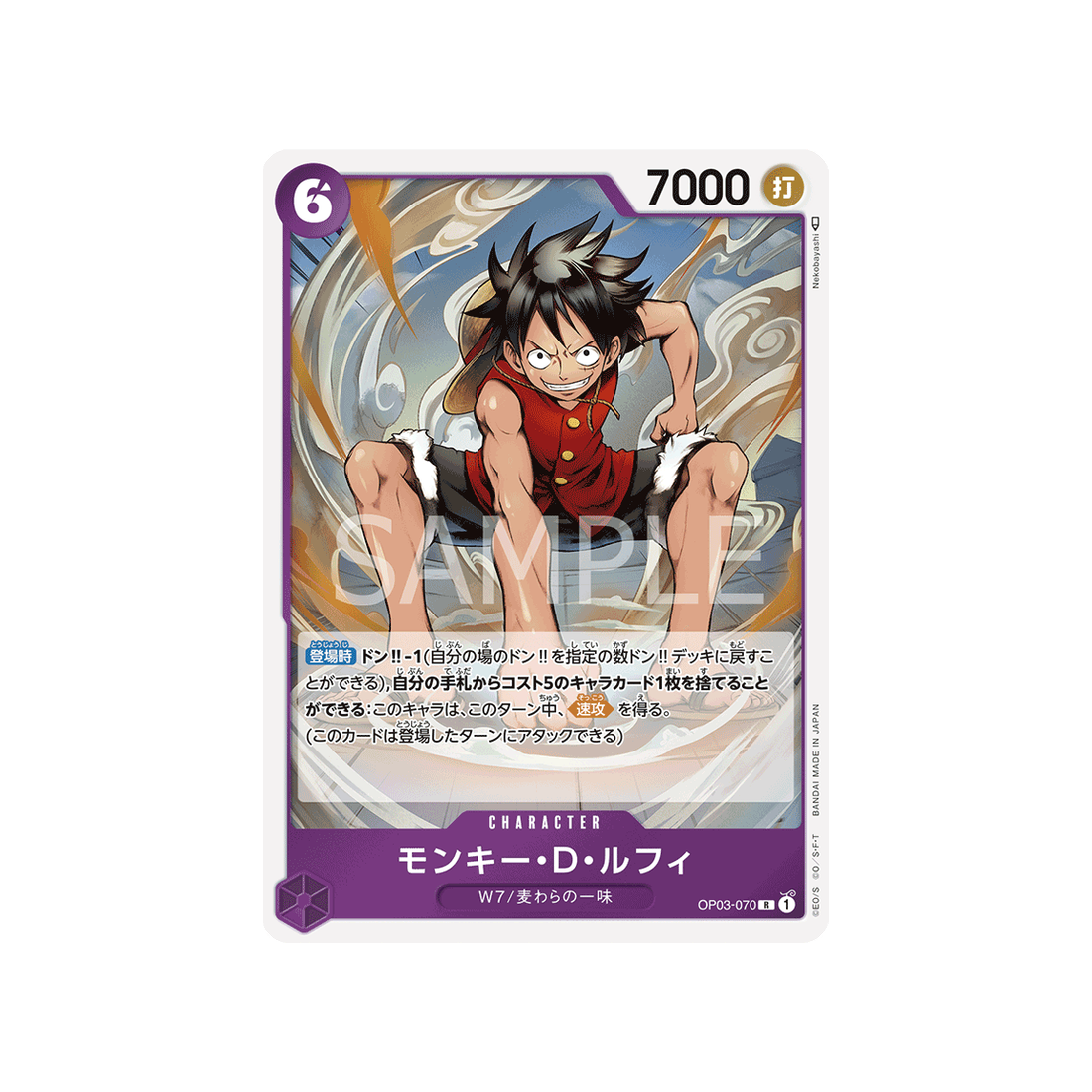 Si tu cherches une carte qui peut s'adapter à toutes les situations, ne cherchez pas plus loin que la carte OP03-070! Avec un coût de 6 'Don!', une puissance Frappe de 7000 points et de couleur Violet, la carte Character Monkey D. Luffy est un choix fiable pour les joueurs de tous niveaux.