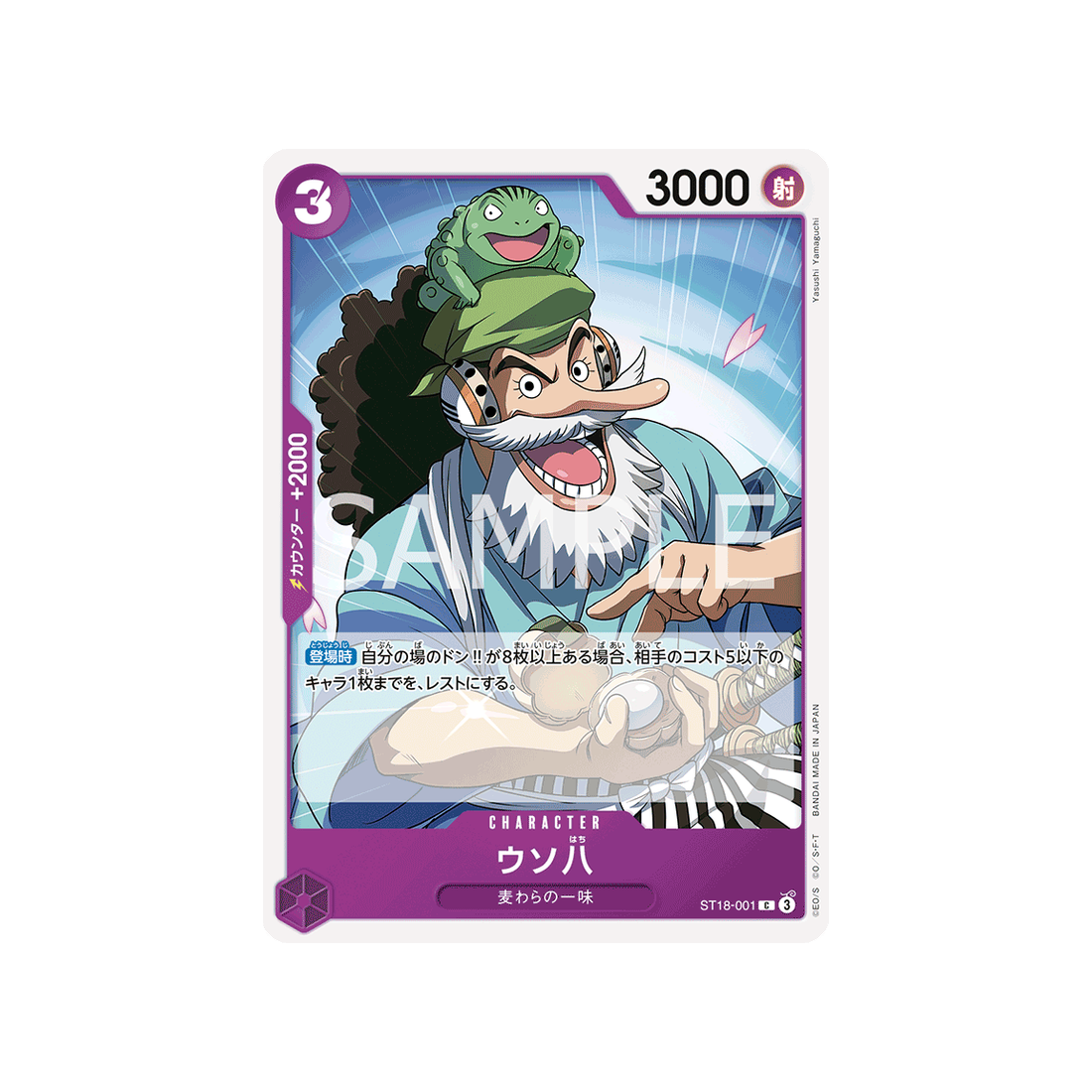 Que tu sois novice ou joueur expérimenté, la carte OPC-ST18-001 est un choix fiable. Avec un coût de 3, ainsi qu'une valeur de contre de 2000 et une attaque de type Distance d'une puissance de 3000 points, elle peut s'adapter à toutes les situations. Un incontournable pour tout duelliste One Piece TCG !