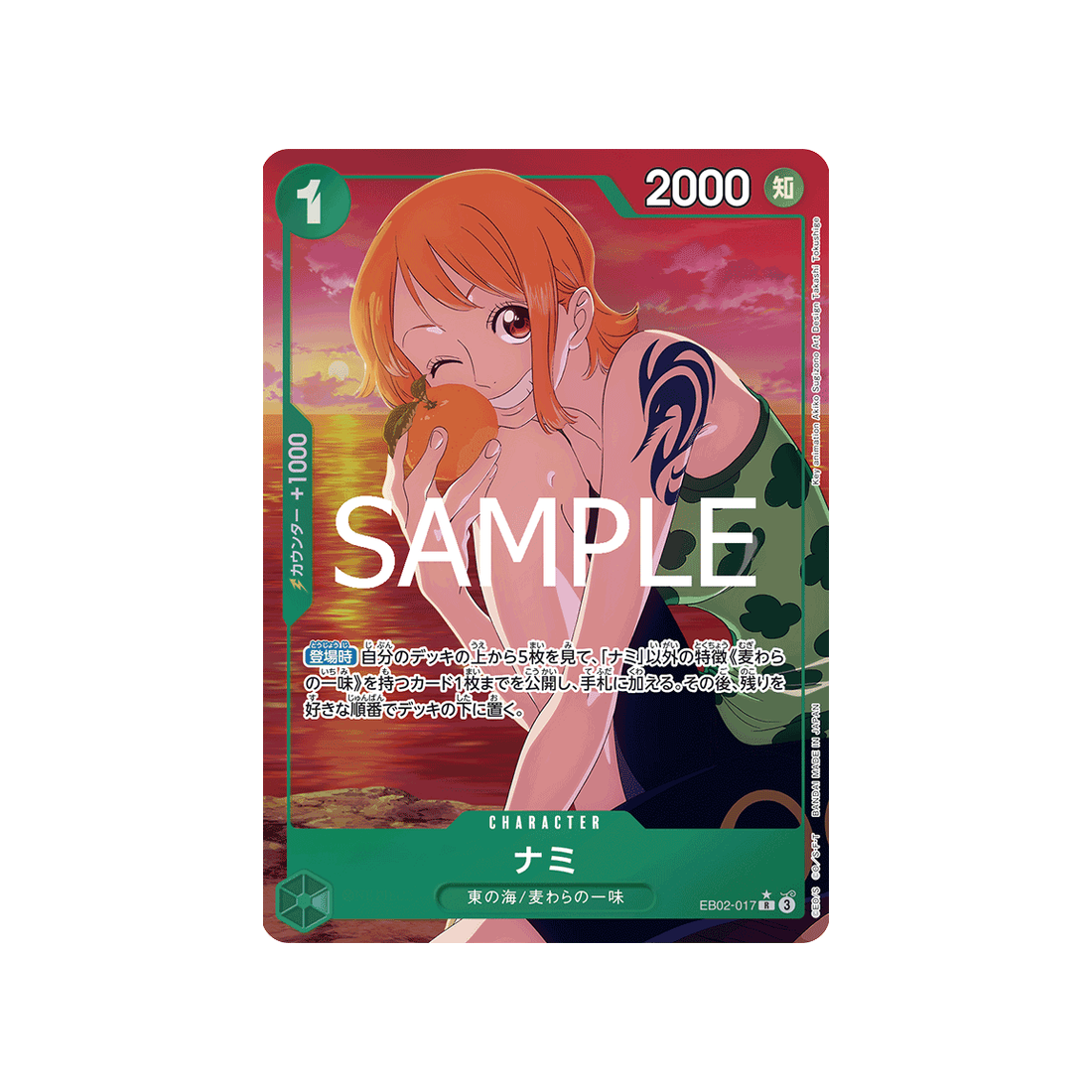 Avec un coût de 1 'Don!', une puissance de 2000 points, ainsi qu'une valeur de contre de 1000 et une attaque de type Sagesse, la carte Character Nami est un must-have pour tout fan de One Piece qui se respecte.