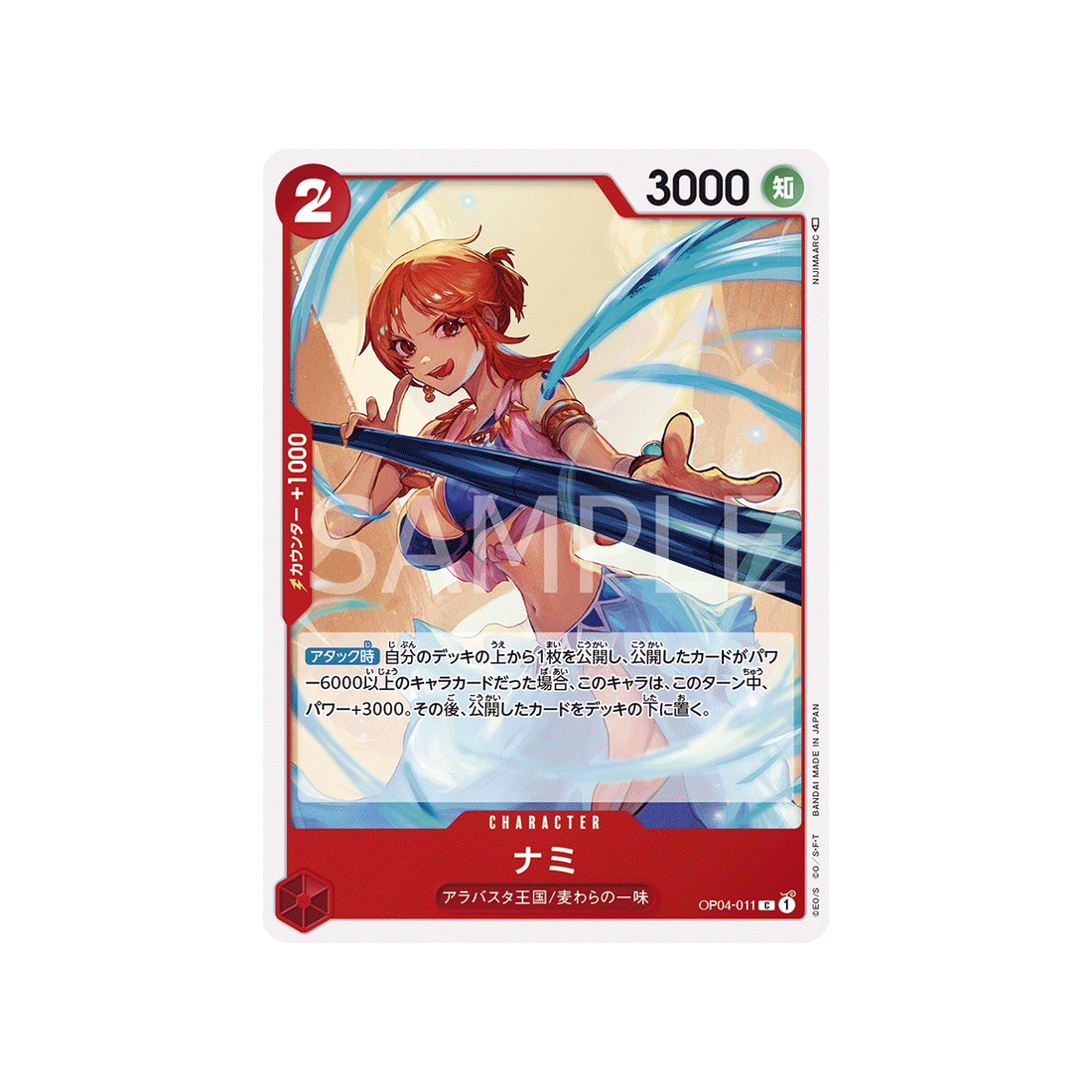 Le Character est une carte indispensable dans tout deck qui se respecte ! Et Nami sera ton allié le plus précieux : de couleur Rouge et avec l'attribut Sagesse, il fera des ravages via un coût de 2 'Don!' et sa puissance de 3000 points, ainsi qu'une valeur de contre de 1000!