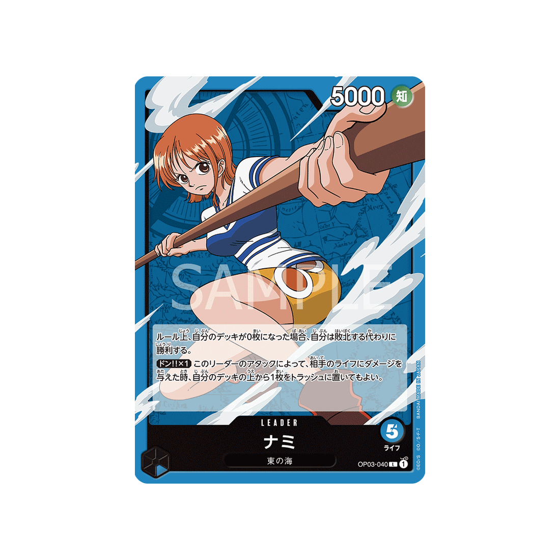 Le Leader est une carte indispensable dans tout deck qui se respecte ! Et Nami sera ton allié le plus précieux : de couleur Bleu et avec l'attribut Sagesse, il fera des ravages via ses 5 points de vie et sa puissance de 5000 points!