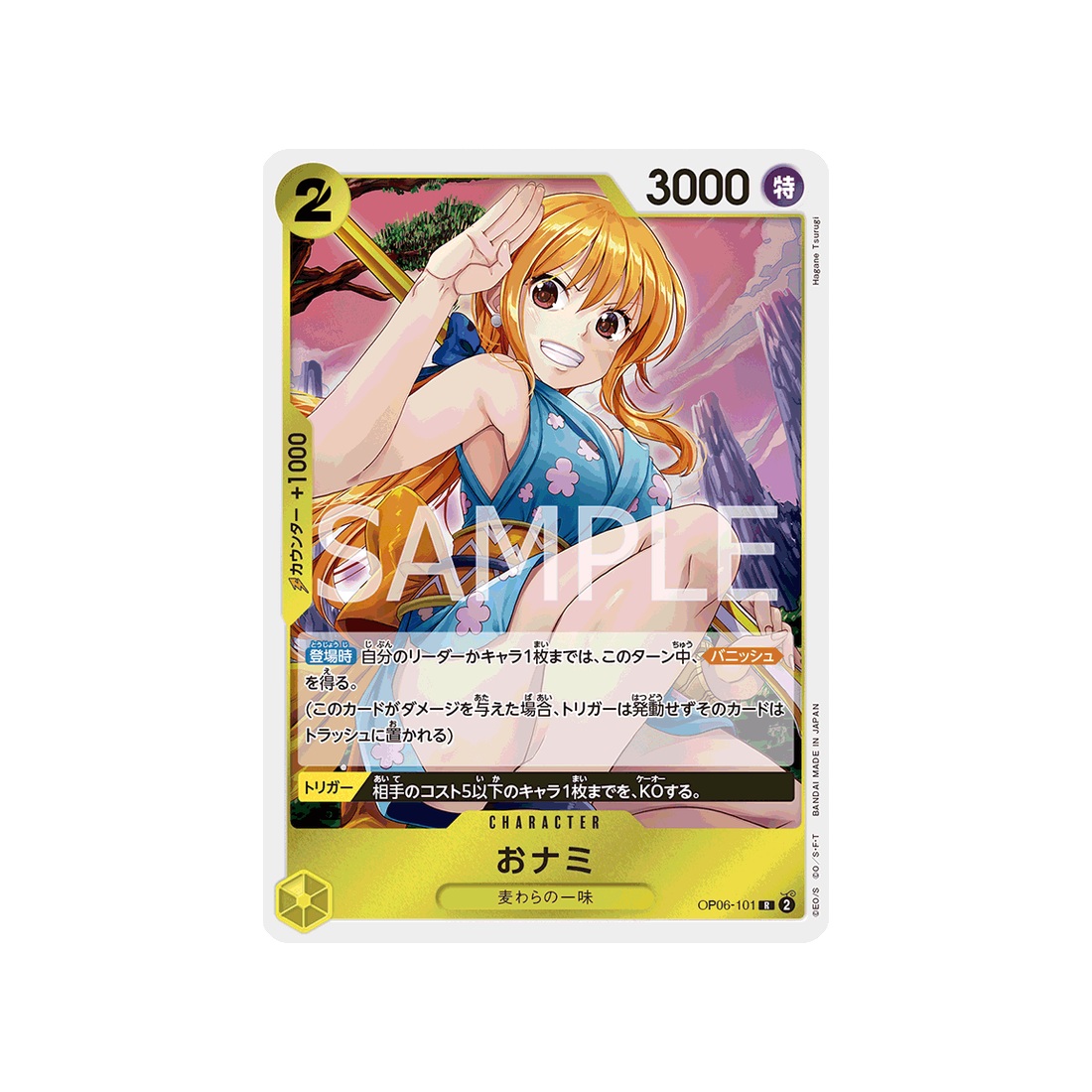Le type Character est une carte indispensable dans tout deck qui se respecte ! Et O-Nami sera ton allié le plus précieux : de couleur Jaune et avec l'attribut Spécial, il fera des ravages via un coût de 2 'Don!' et sa puissance de 3000 points, ainsi qu'une valeur de contre de 1000!