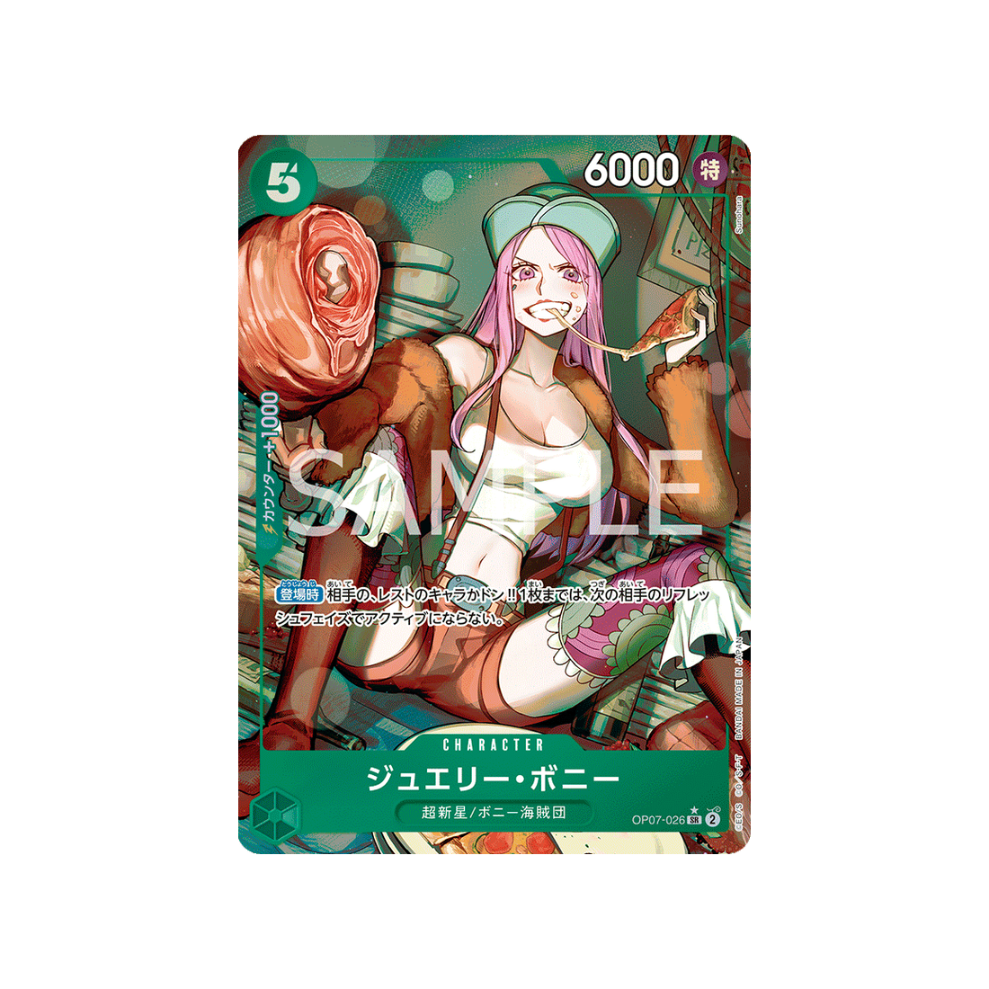 Si tu cherches une carte qui peut s'adapter à toutes les situations, ne cherchez pas plus loin que la carte OP07-026! Avec un coût de 5 'Don!', une puissance Spécial de 6000 points, ainsi qu'une valeur de contre de 1000 et de couleur Vert, la carte Character Jewelry Bonney est un choix fiable pour les joueurs de tous niveaux.
