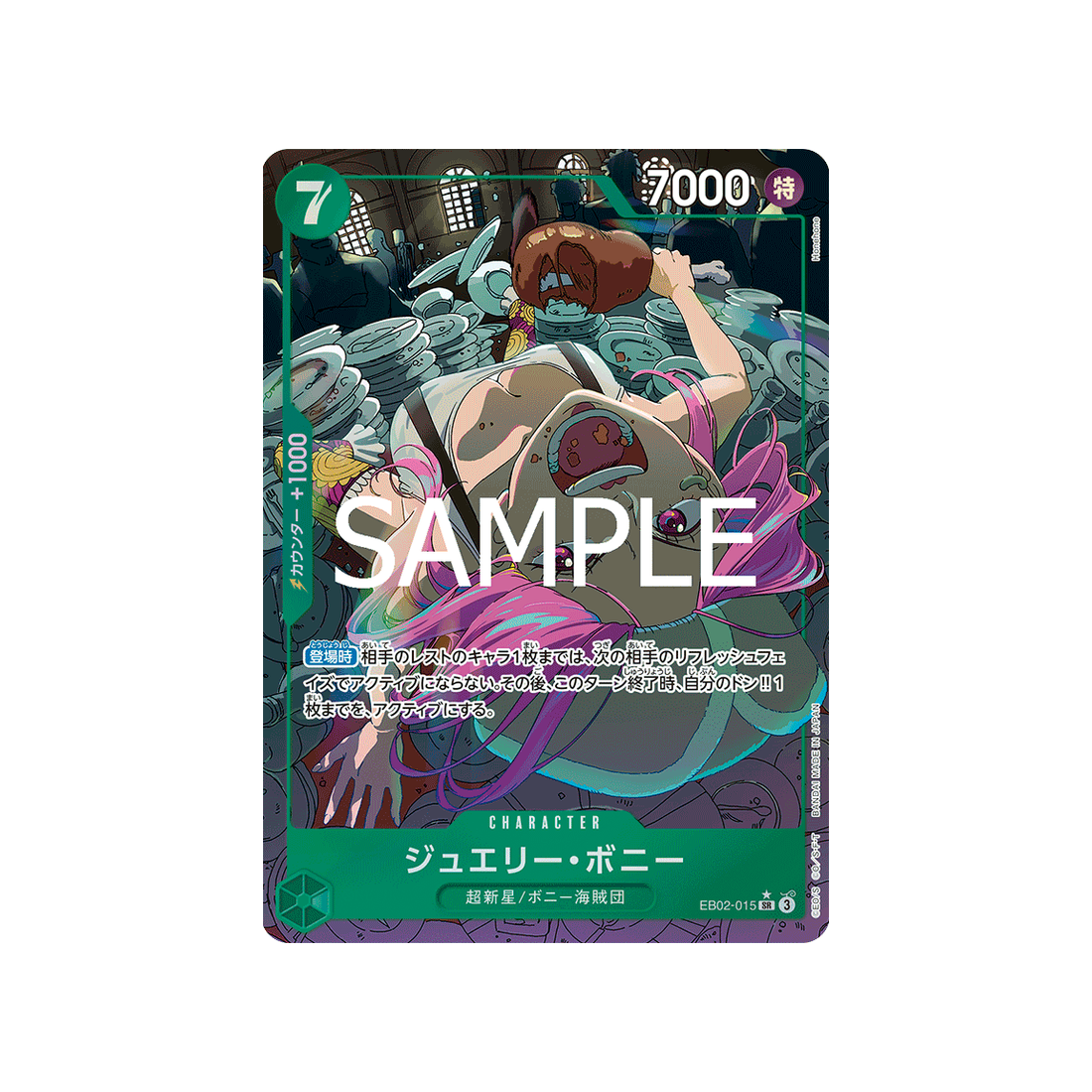 Que tu sois novice ou joueur expérimenté, la carte OPC-EB02-015-P1 est un choix fiable. Avec un coût de 7, ainsi qu'une valeur de contre de 1000 et une attaque de type Spécial d'une puissance de 7000 points, elle peut s'adapter à toutes les situations. Un incontournable pour tout duelliste One Piece TCG !
