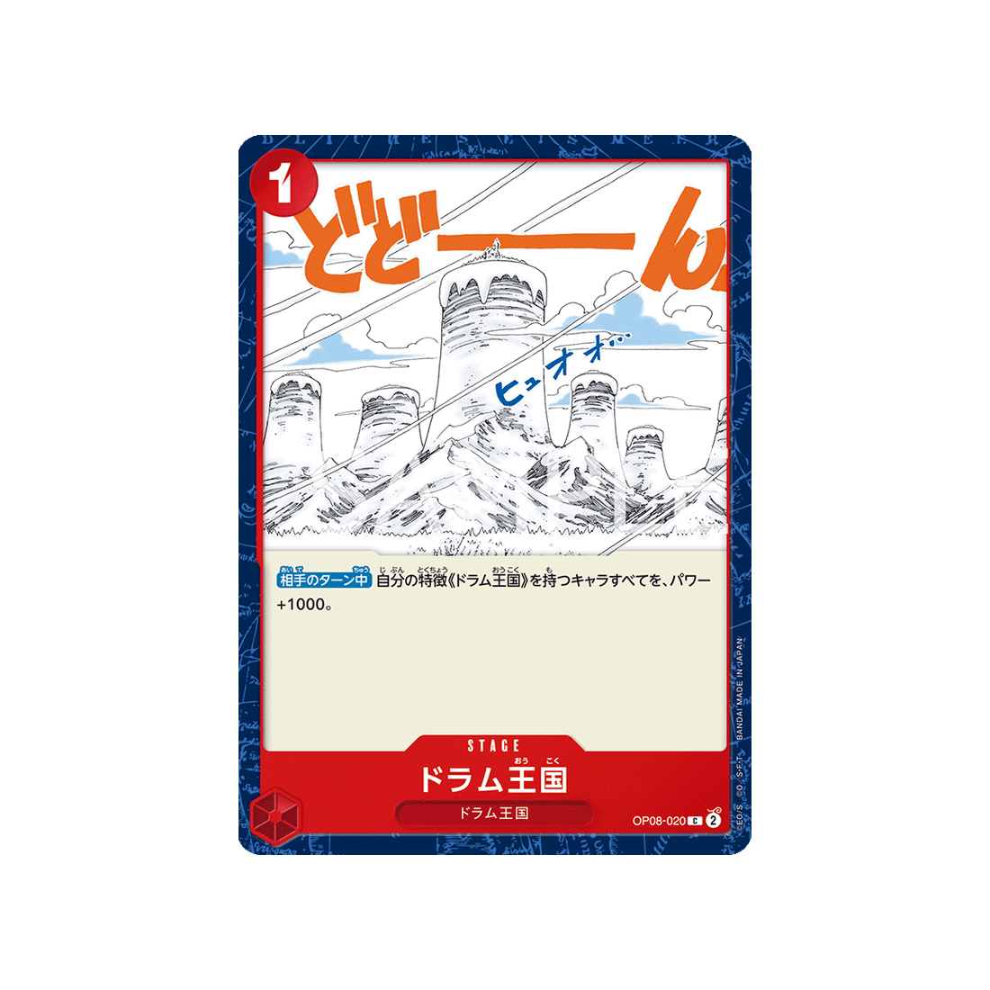 Ajoutez la carte Stage Drum Kingdom à votre collection One Piece dès maintenant ! Avec sa rareté C , cette carte de la série OP08 Two Legends est un véritable bijou pour les fans de la famille Ile de Drum.