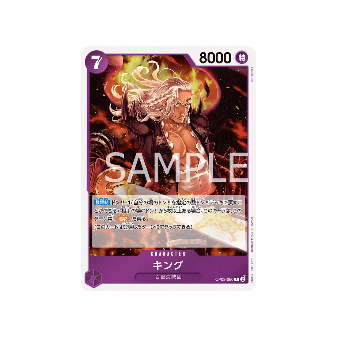 Le type Character est une carte indispensable dans tout deck qui se respecte ! Et King sera ton allié le plus précieux : de couleur Violet et avec l'attribut Spécial, il fera des ravages via un coût de 7 'Don!' et sa puissance de 8000 points!
