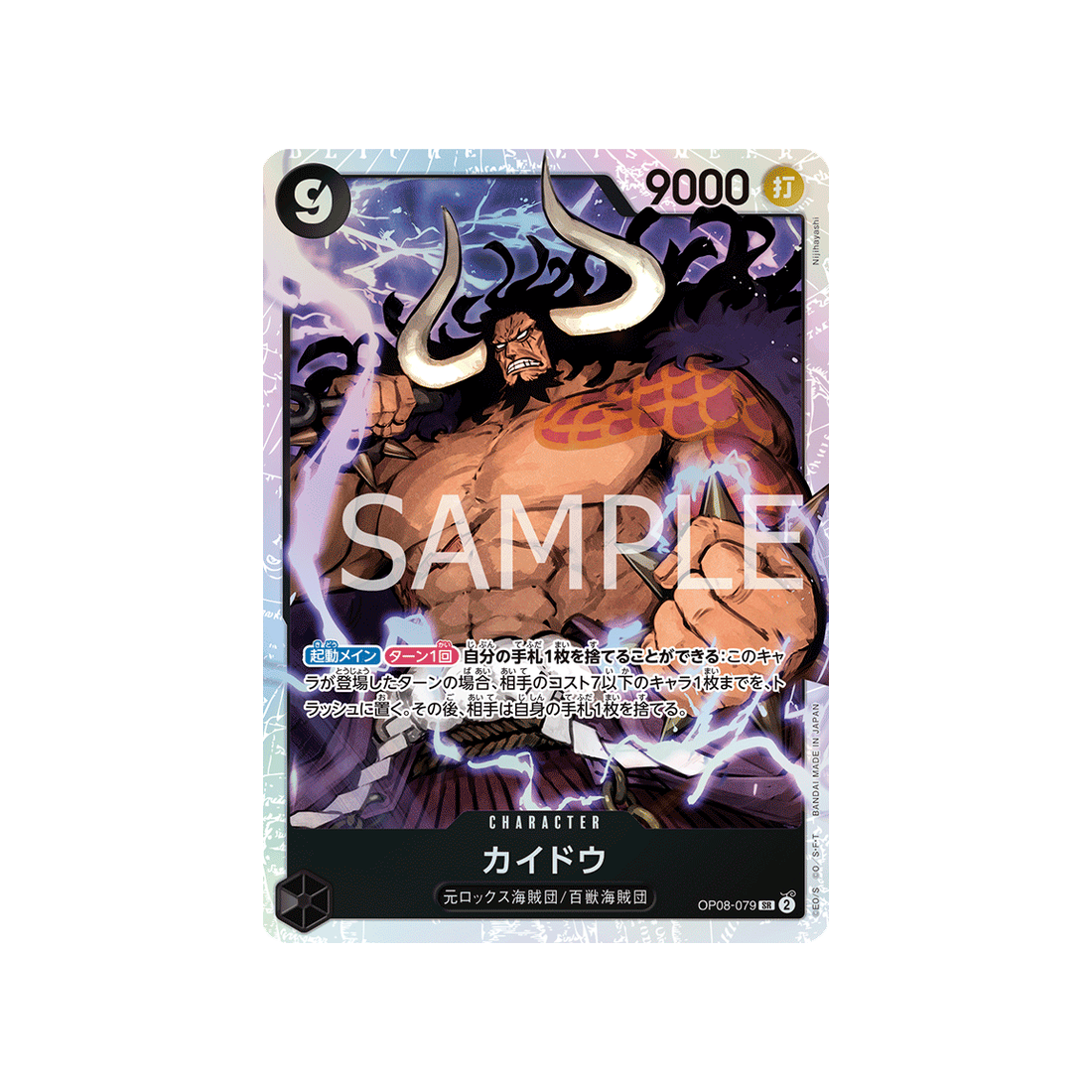 Le type Character est une carte indispensable dans tout deck qui se respecte ! Et Kaido sera ton allié le plus précieux : de couleur Noir et avec l'attribut Frappe, il fera des ravages via un coût de 9 'Don!' et sa puissance de 9000 points!