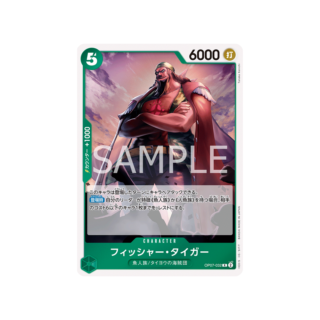 Ajoutez la carte Character Fisher Tiger à votre collection One Piece dès maintenant ! Avec sa rareté R , cette carte de la série OP07 500 Years In The Future est un véritable bijou pour les fans de la famille Homme-Poisson/L'équipage du Soleil.