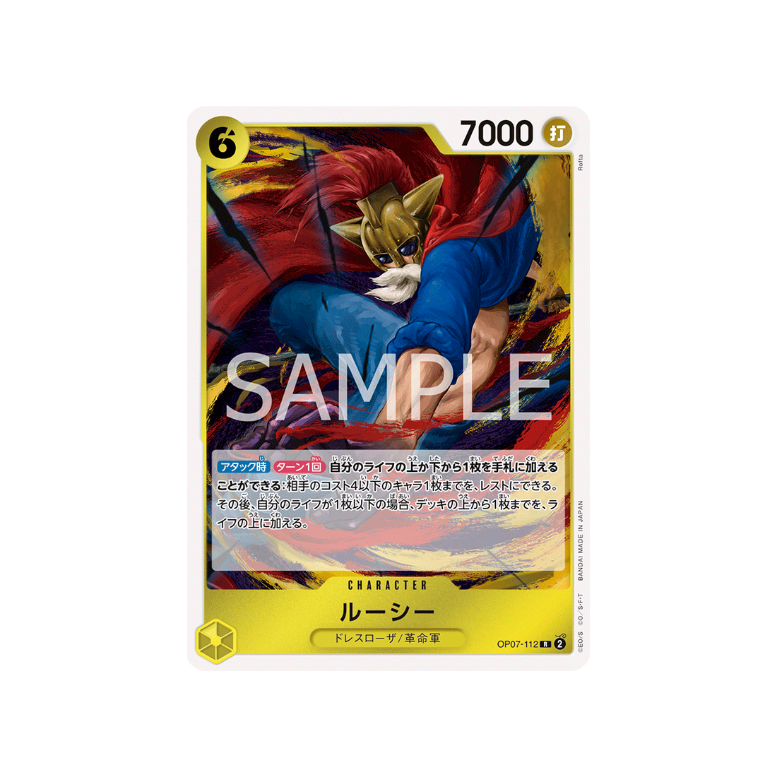 Si tu cherches une carte qui peut s'adapter à toutes les situations, ne cherchez pas plus loin que la carte OP07-112! Avec un coût de 6 'Don!', une puissance Frappe de 7000 points et de couleur Jaune, la carte Character Lucy est un choix fiable pour les joueurs de tous niveaux.